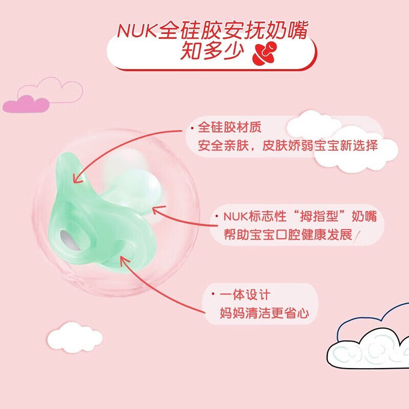 这款NUK 宽口玻璃奶瓶,清洗方便;母乳仿真奶嘴,轻松断奶,自动进气系统,减少胀气和腹痛;印花硅胶安抚奶嘴,轻松哄睡,带收纳盒,防尘易收纳。