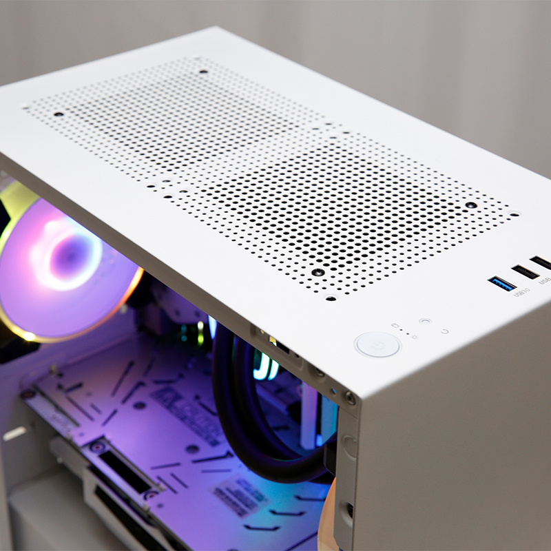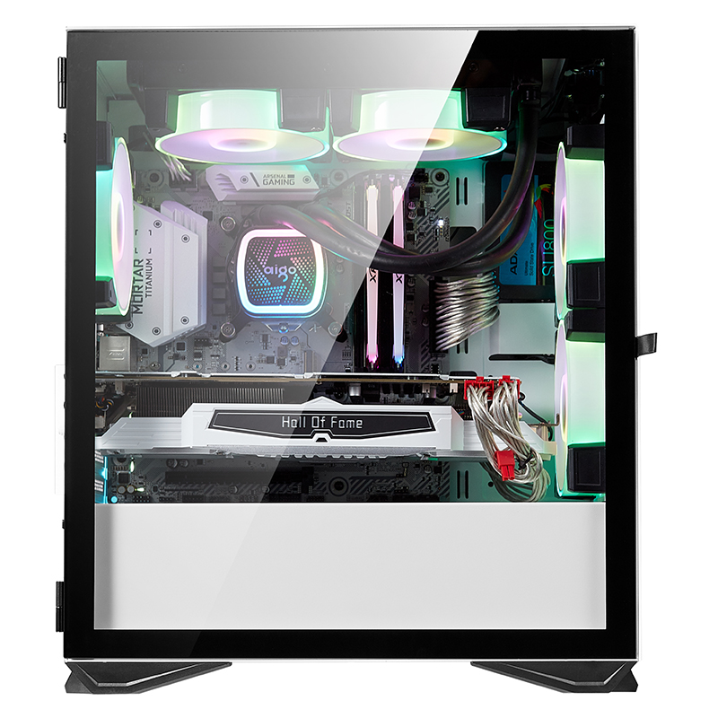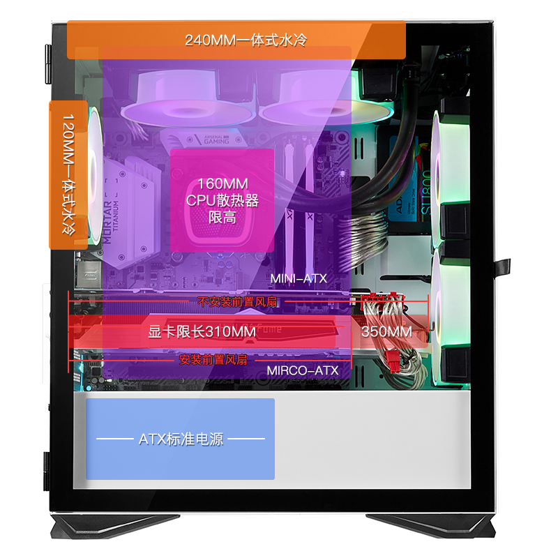 整机尺寸360x208x425mm,支持M-ATX、ITX板型,5风扇位、4扩展槽,支持350mm显卡,长达210mm电源仓及160mm CPU散热器;具备可拆卸机械硬盘架,壁挂式固态硬盘架。磁吸开合式全透侧玻璃面板。