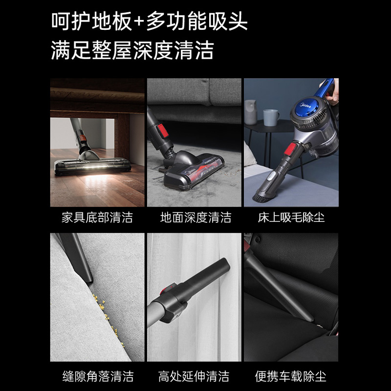 Midea 美的 P3 Multi 手持式吸尘器 升级160W功率,吸力提升40%,有效清洁缝隙有助吸除过敏源。自带LED探污灯清扫不盲除,即使在室内光效不好的床底、灰尘污垢也会原形毕露。