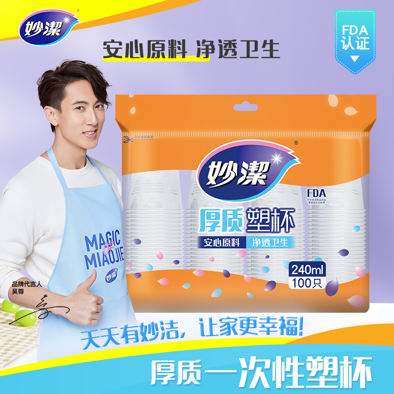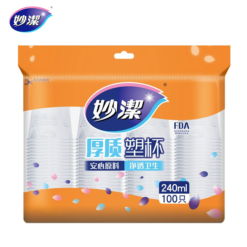 MIAOJIE 妙洁 7023 塑料一次性纸杯,选用食品级PP材质,环保耐用,经过高温灭菌处理,安全无异味;杯身厚实,杯口大,畅饮尽兴;杯底三点挡板设计,不易叠合过紧,易于抽取,方便实用。规格:240ml*100只。
