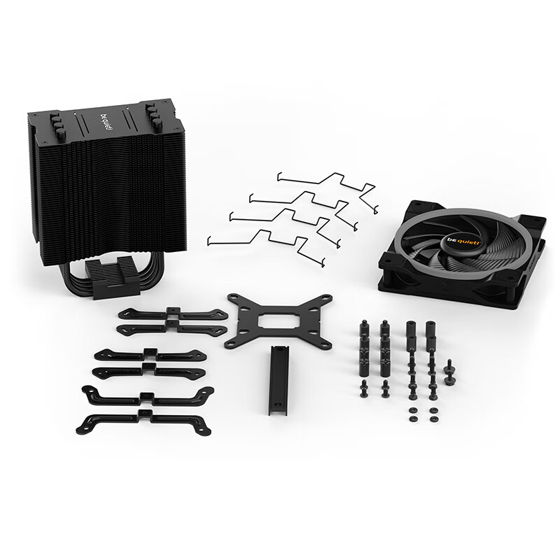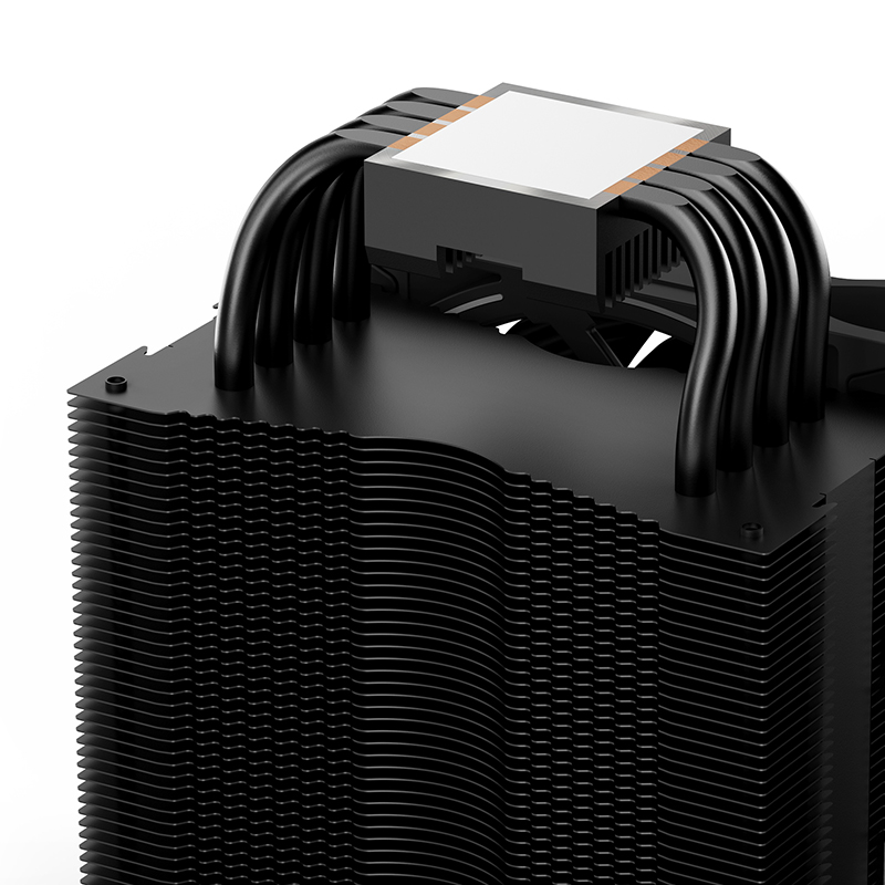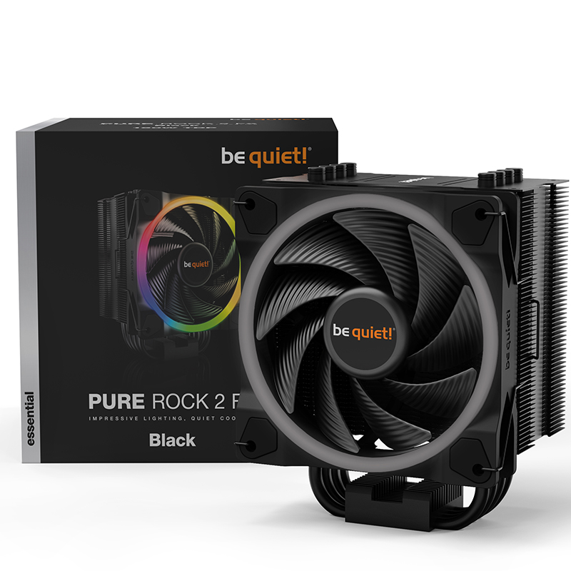 散热整体采用了非对称结构设计,很大程度上节省了主机的安装空间,无需担忧遮挡内存槽问题,轻松插满。散热器拥有四根高导热性能的6mm复合材料热管 ,密集的鳍片经黑化工艺处理,不仅仅是外观典雅有质感,更可以增加导热性能。Pure Rock 2 FX Black拥有150W的散热设计功耗,迅速带走CPU热量,适用于各种高端电竞游戏主机。散热器配备带有18枚LED灯珠的Light Wings 120mm PWM high-speed 散热风扇,支持ARGB 可编程灯效控制;风扇正反面均有灯光效果,全方位提供灯光氛围。经特殊优化过的扇叶,能够使得Pure Rock2FX Black 能够保持低噪音的运行状态。