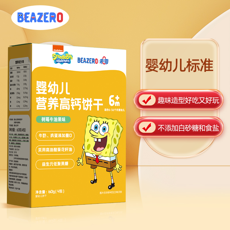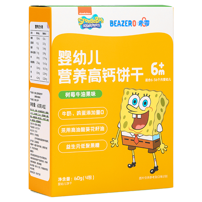 Beakid是美国JOY PARTNER LIMITED旗下品牌,美国海绵宝宝官方授权,Beakid为6个月-3岁的婴幼儿提供健康辅食,产品包括米饼、溶豆、饼干、面条、泡芙等。这款婴幼儿营养造型饼干选用优质小麦和新鲜果蔬,不加糖、盐、香精、色素、防腐剂等,强化钙铁锌、添加多种维生素,特别添加低聚果糖FOS,呵护宝宝肠道健康,促进消化吸收,饼干具有多种奇趣造型,让宝宝边吃边玩,形状小巧好拿捏,松软可口,容易吞咽。
