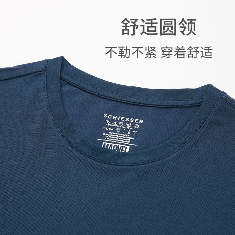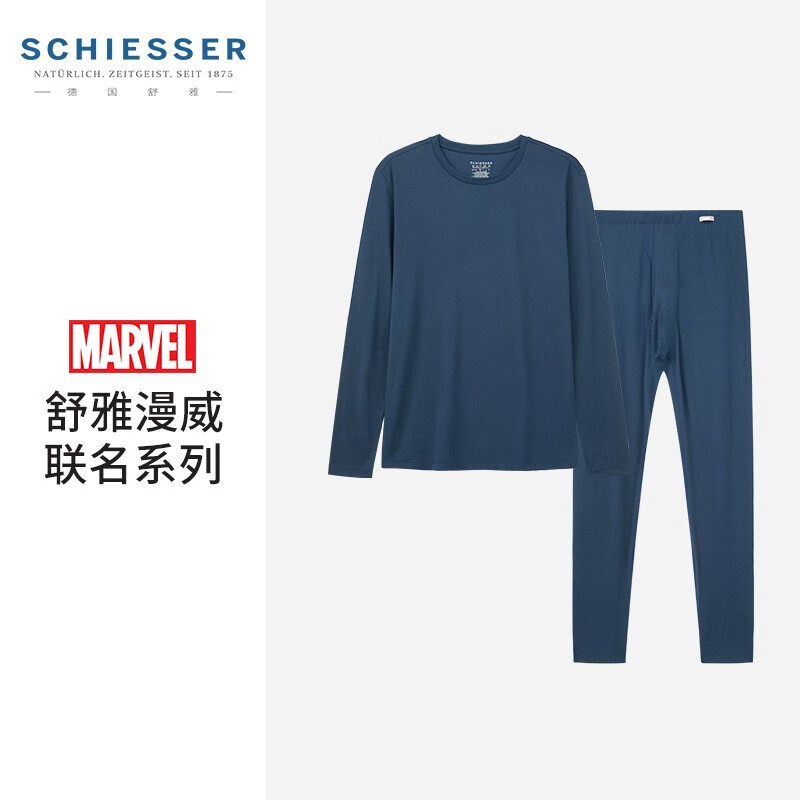 SCHIESSER 舒雅 漫威IP联名 男士保暖秋衣裤套装 E5/19954W,有效将人体的湿气转换为热能,良好的抗起球、抗静电特性,混纺工艺让衣物更细密光滑。无感印唛,减少穿着刺痛感彻底无痕,胸前印花,拥有无限能量的反应堆。