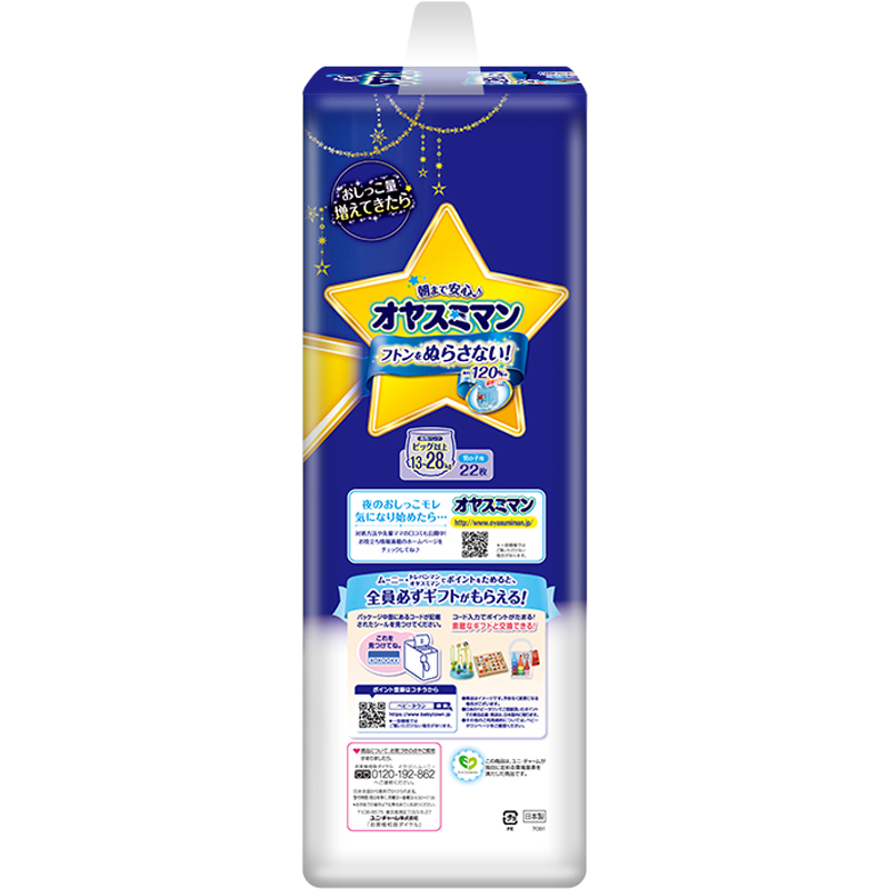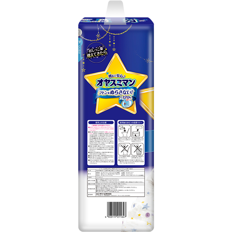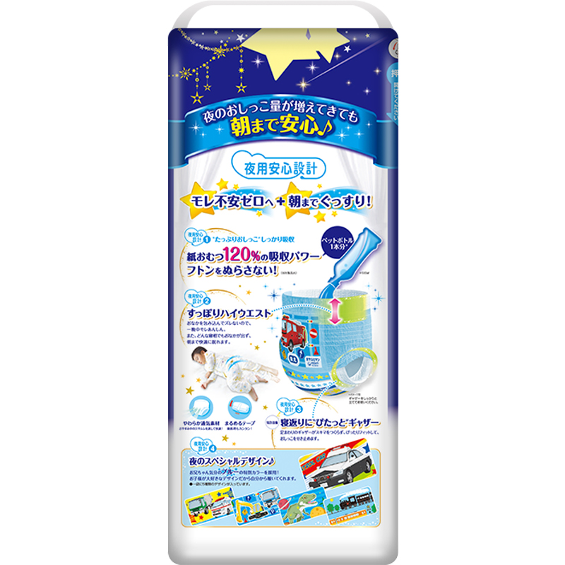 moony纸尿裤是日本unicharm 尤妮佳集团旗下的纸尿裤品牌,是日本四大品牌纸尿裤之一,享有“尿裤之王”的美誉。其母公司在中国运营有“苏菲”妇女生理用品及“妈咪宝贝”婴儿纸尿裤等产品。这款moony 尤妮佳男宝宝安睡裤采用专利技术,整夜同步贴合吸收体,翻身贴合腰围,腿围不易形成空隙,有效防止漏尿。柔软透气材质,排出睡眠中的出汗,闷热。吸收一整夜尿量也不渗漏,夜间专用,小朋友可以一觉熟睡到天亮。规格为XL22片。