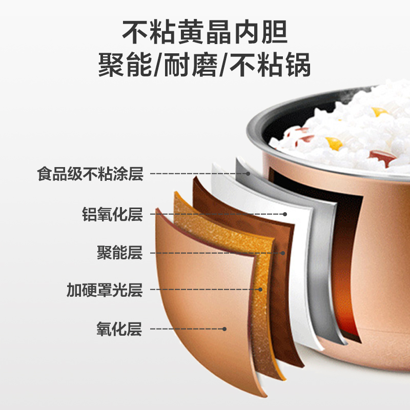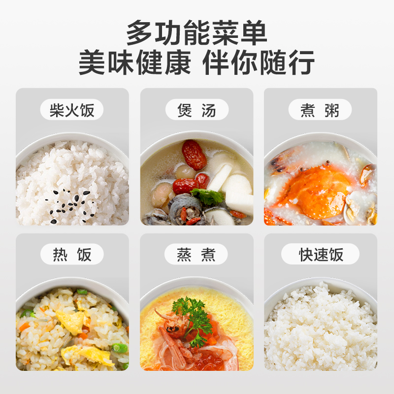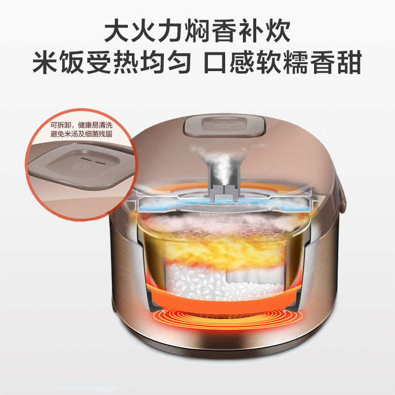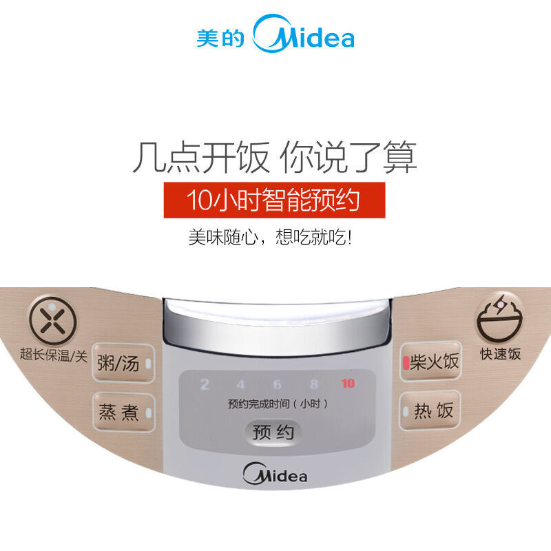 美的MB-WFD4016电饭煲,容量4L,内胆锅采用不粘涂层黄晶内胆,带有超快煮、柴火饭、热饭、蒸煮、粥汤等多种模式,最长可预约10小时。外观采用金属拉丝设计,蒸汽阀可拆洗。附赠蒸格、量米杯、饭勺及汤勺。