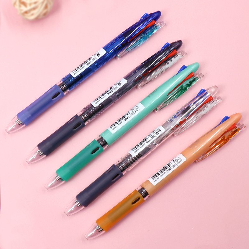 ZEBRA 斑马 B3A5 四色圆珠笔,大弧度笔夹,印有银色的Clip-on Slim,软胶笔握设计,书写使用时舒适,笔杆上贴的标签印有产品型号,颜色和替芯等信息,子弹头笔尖设计不易断墨,书写顺畅,四色笔芯。