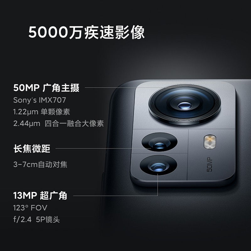 影像系统方面,小米 12s采用后置三摄+前置3200万像素方案,主摄采用索尼IMX707 5000万像素1/1.28英寸超大底CMOS,F1.9超大光圈,2.44um四合一像素,同时支持OIS光学防抖以及全像素八核对焦,还配置1300万像素超广角镜头+500万长焦微距。