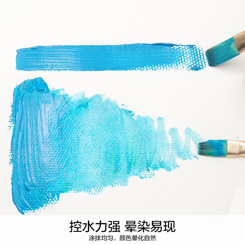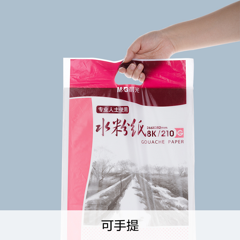 水粉纸区别于水彩纸、素描纸、速写纸等,在纸张表面有无数圆形微小的凹槽,因为水粉的遮盖性非常高,因此这些小凹槽不会影响绘画,但是对纸张的克数要求比较高,需要能够快速吸水。本款水粉纸为晨光出品,克数为210g,吸水性良好,规格为8K,每袋20张。