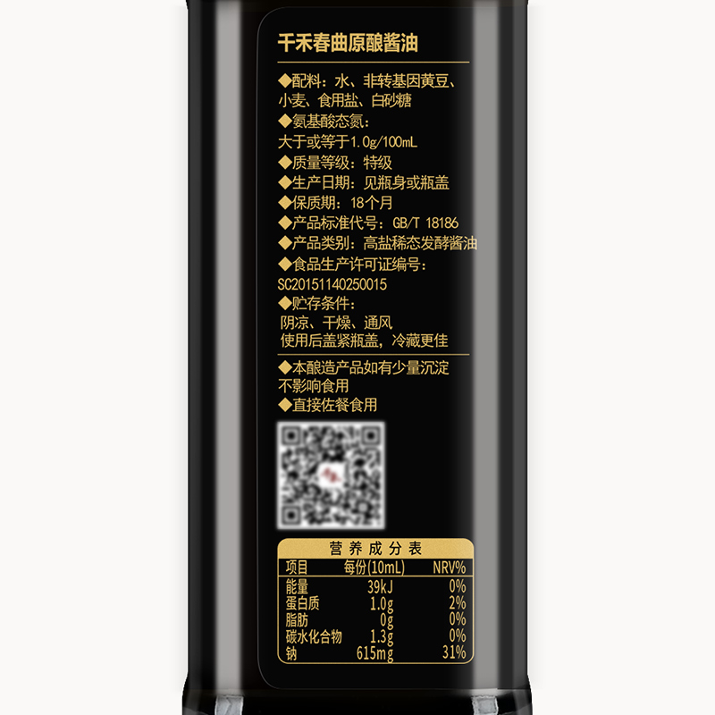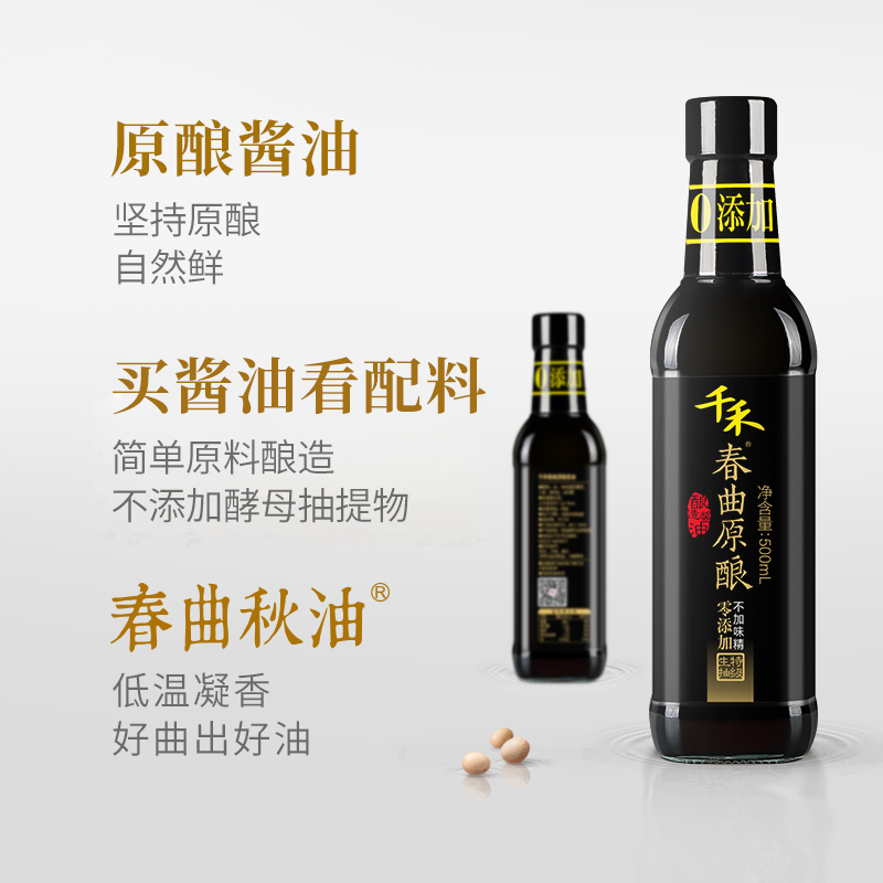 千禾 春曲原酿生抽 零添加酿造酱油。产地:四川省。以黑龙江省种植收仓的优质黄豆和优质小麦为主原料,多道筛选,源头把关。封闭式圆盘制曲,隔离污染同时适于多菌种萌发生长,好曲出好酱油。封罐密制,低温凝香,多菌种协同自然发酵,氨基酸自然生成,凤味物质缔合平衡。零添加。规格:500ml。