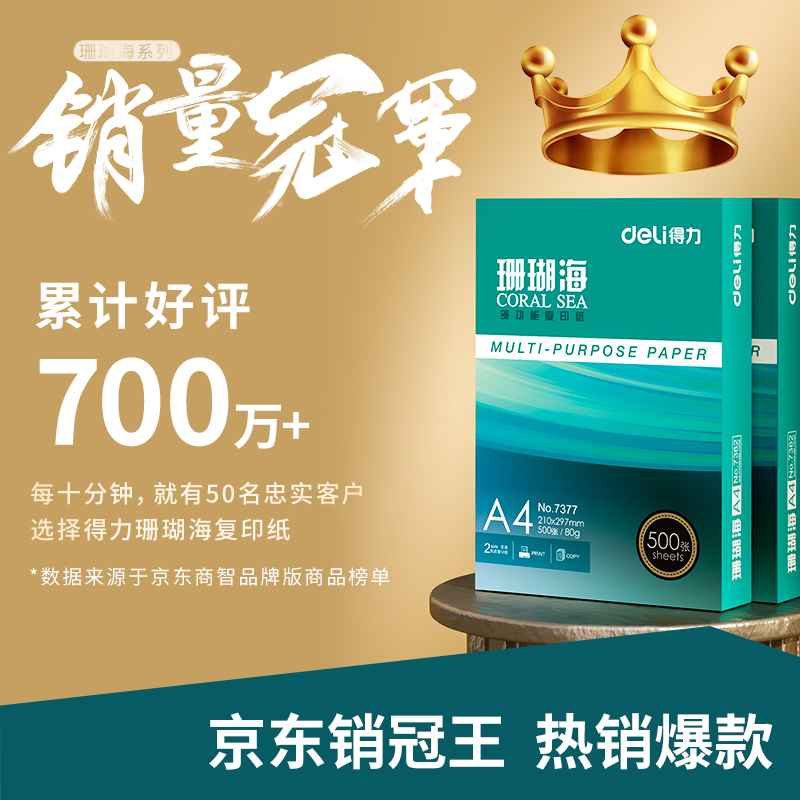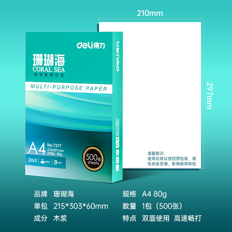 得力(Deli)这款A4纸,采用长纤维木浆,兼顾吸水性和柔韧性,抖动时不易掉粉末。单张定量80.1g/㎡,放置桌面时平整纯白无斑点。搭载AKD中性施胶技术,改善纸张强度,增加耐水性,减少污染。纸张横向挺度41mN,纵向挺度97mN,喷墨、双面打印不易卡纸。