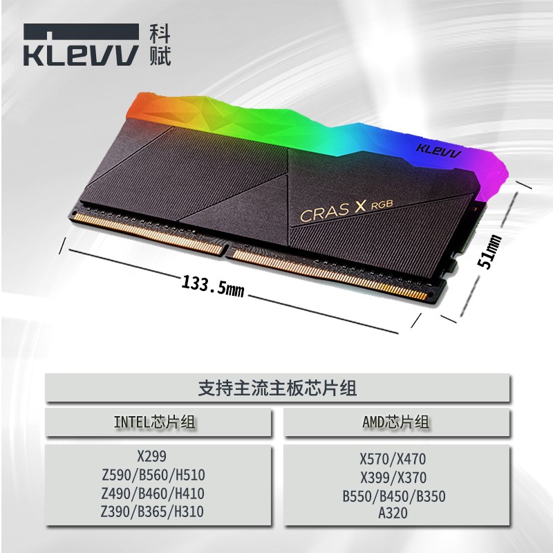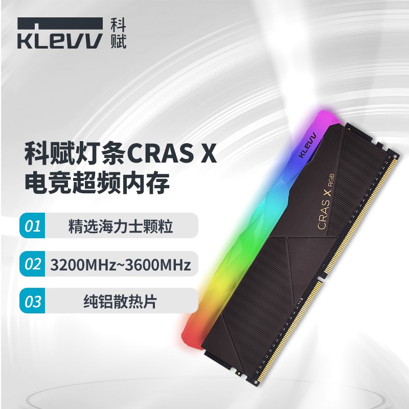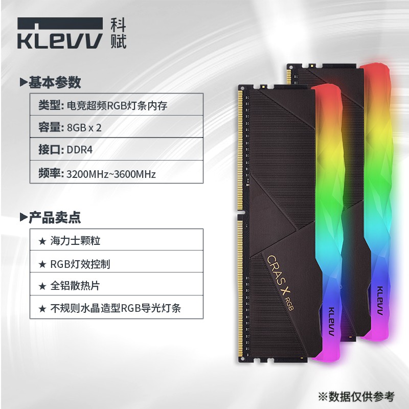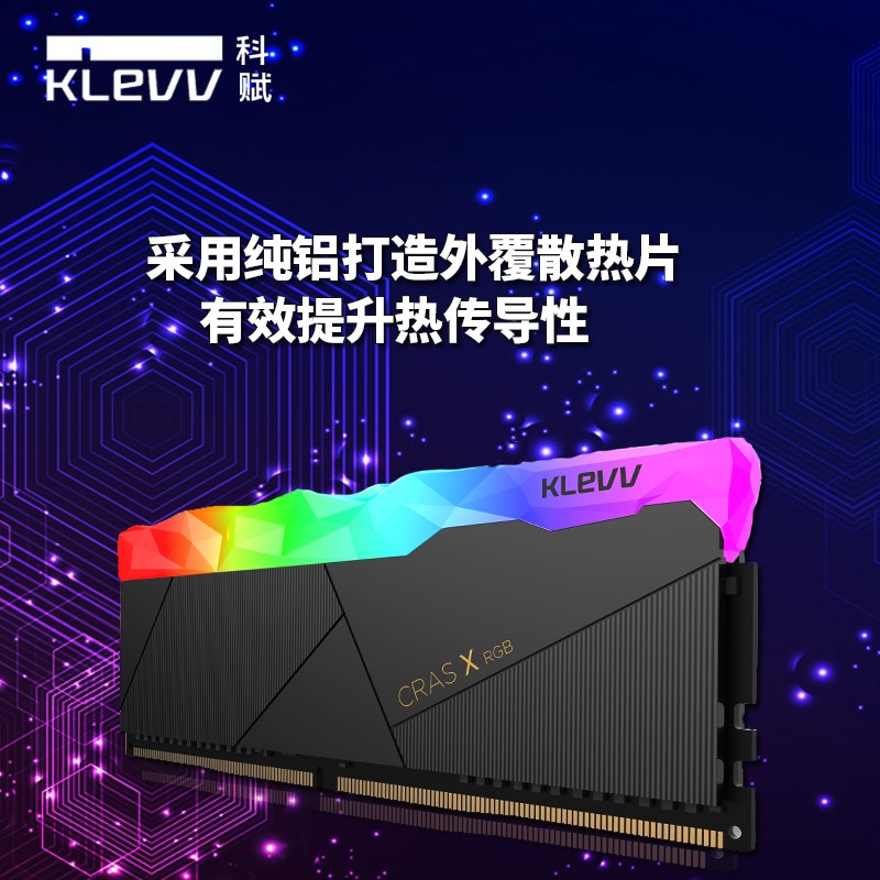 KLEVV CRAS X RGB 采用纯铝打造外覆散热片,拥有精雕细琢的水晶造型导光条,不规则的水晶宝石导光条,让RGB光线能从不同角度多元散射,让RGB流光效果强化升级。内存颗粒使用海力士精选C代或D代颗粒,强悍的超频能力被广大玩家追捧。此版本频率为3600MHz,单条容量8GB,时序18-22-22-42,尺寸:133.5 x 51 x 8 mm。