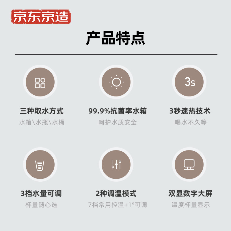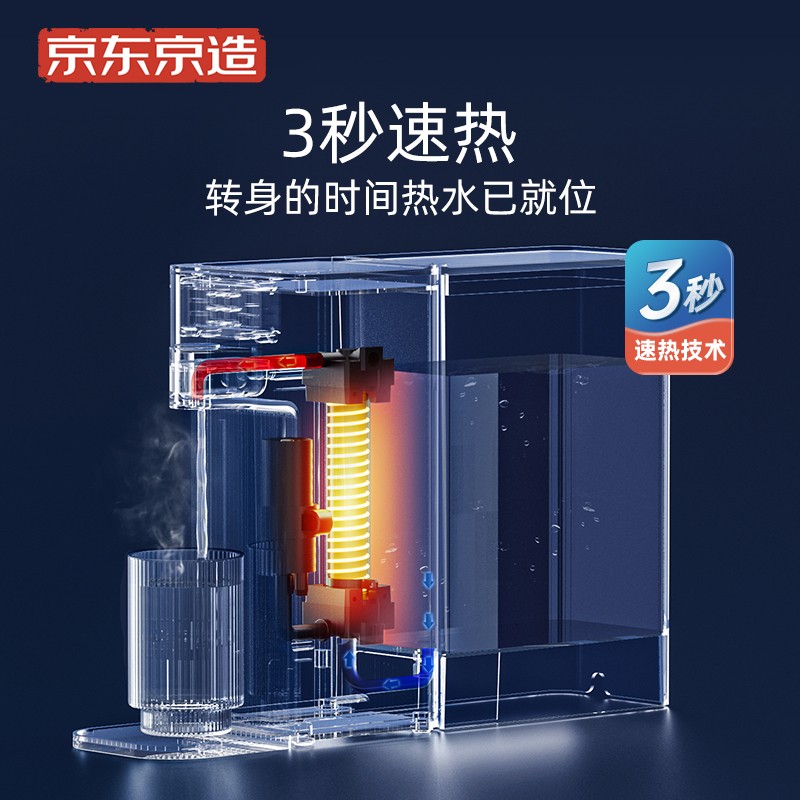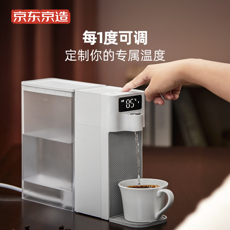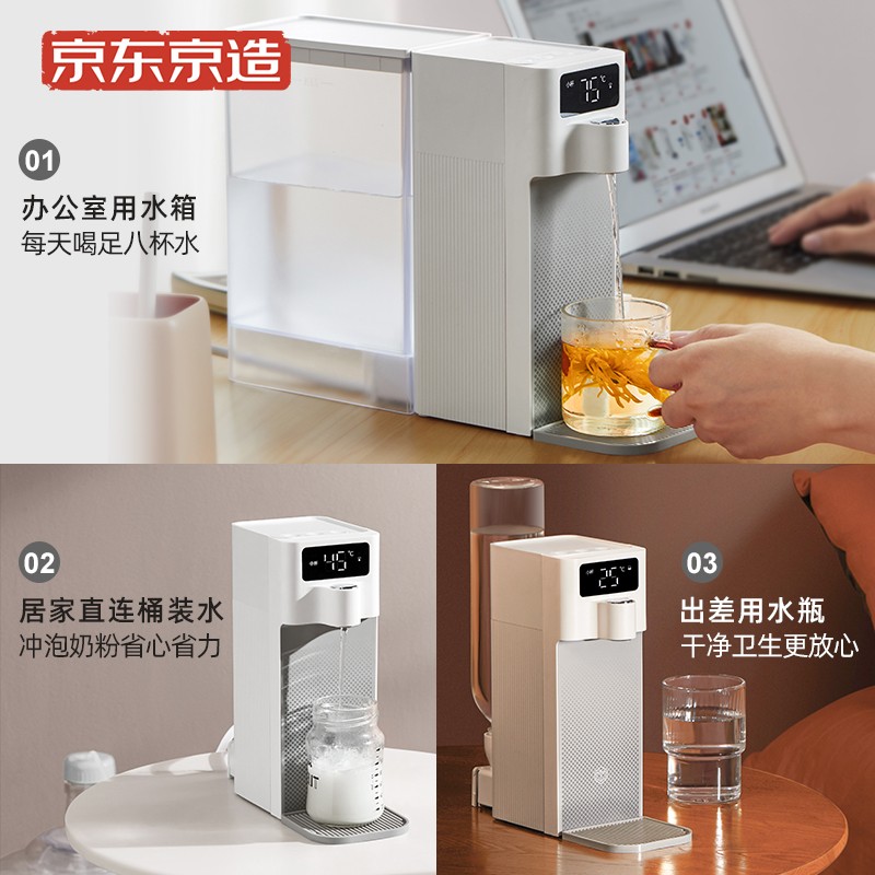 京东京造 JZ-J1 即热式饮水机,多场景使用,标配的1.8L水箱,采用优质抗菌材料,内含抗菌AS母粒, 有效抗菌更卫生。即使给宝宝用,也无需担心。采用新一代复合精瓷加热模组,更加安全可靠, 能够实现常温0秒、热水3秒出水,实现温度自由 2档模式任意切换.
