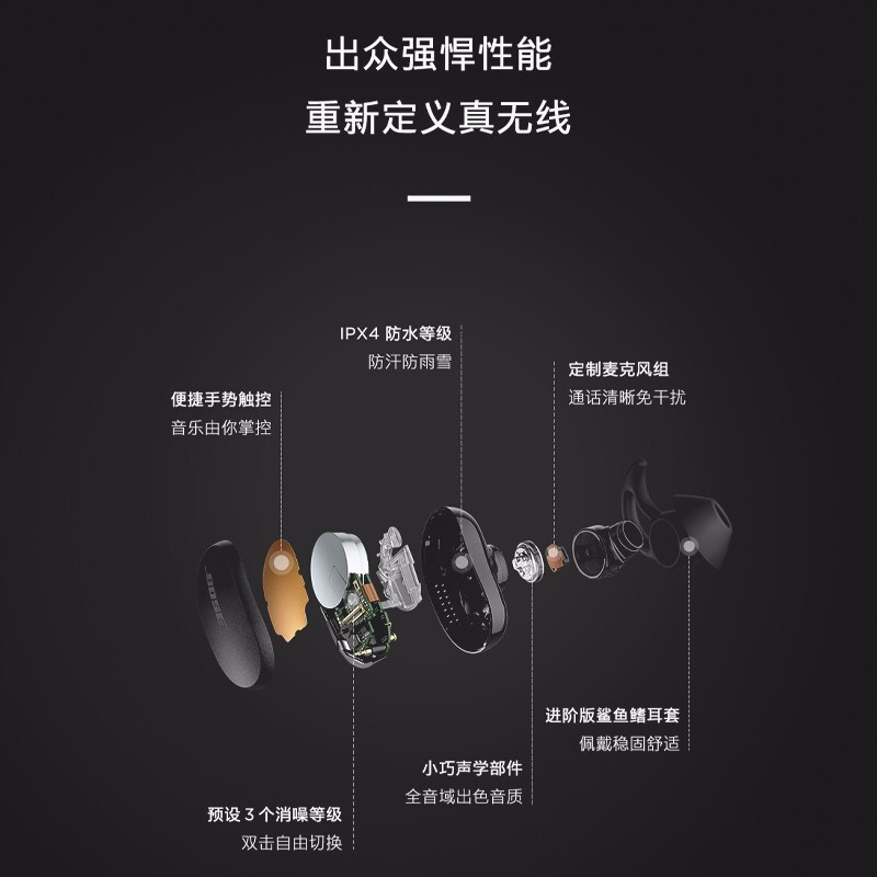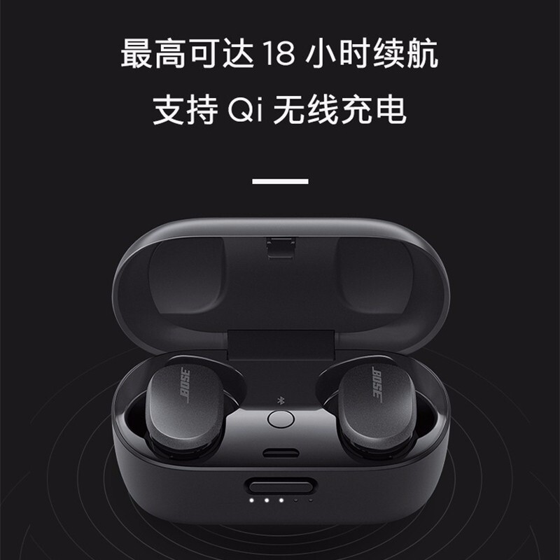 BOSE QuietComfort Earbuds 无线蓝牙降噪耳机,结合主动和被动降噪技术,配备的麦克风可同步检测周围环境和耳道内的噪音,消除各种频段的噪音干扰,同时声学设计结合专有耳塞设计,实现被动降噪。通过Bose音乐 APP可实现11级降噪等级调节。可在APP内预设3个降噪等级。蓝牙5.1连接,搭载动态音质均衡技术,采用进阶板鲨鱼鳍耳套,支持IPX4防水等级。续航时间为6小时,搭配充电盒续航可达18小时,并支持Qi无线充电设备。