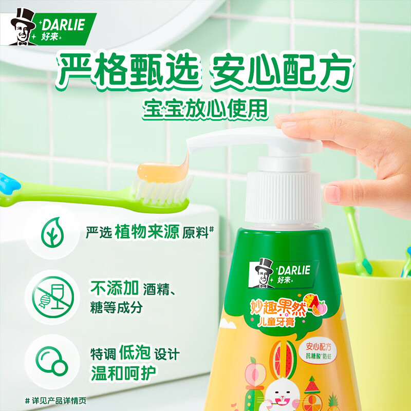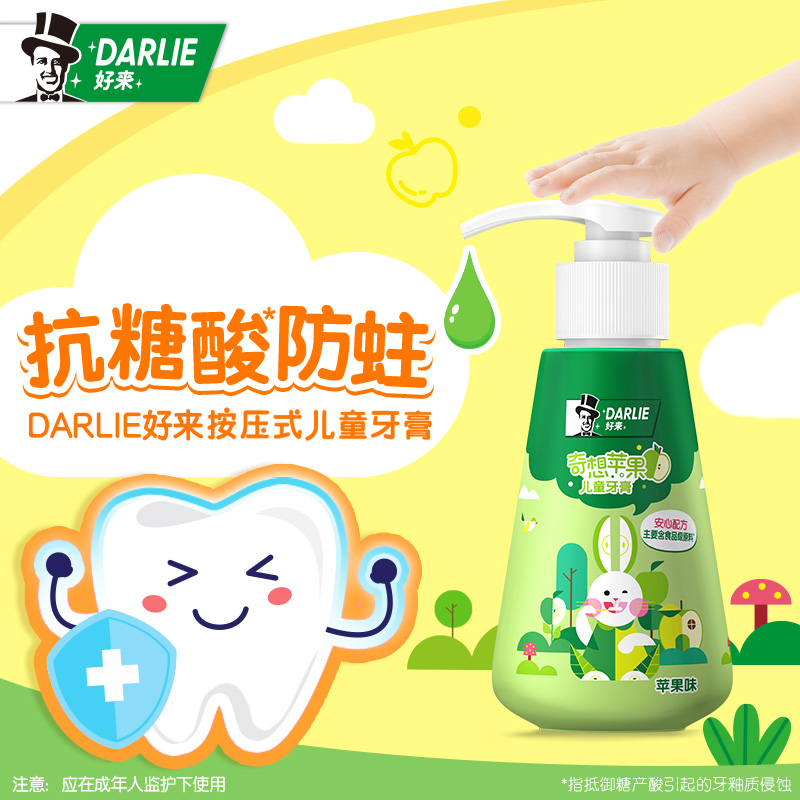 DARLIE 好来 按压式儿童牙膏 120g,配方不加糖,避免糖被口腔中的细菌,利用而导致蛀牙,液体牙膏粘稠度较低,快速溶解容易渗透口腔角落,深入牙逢清洁,不沾水也可刷使用更方便。