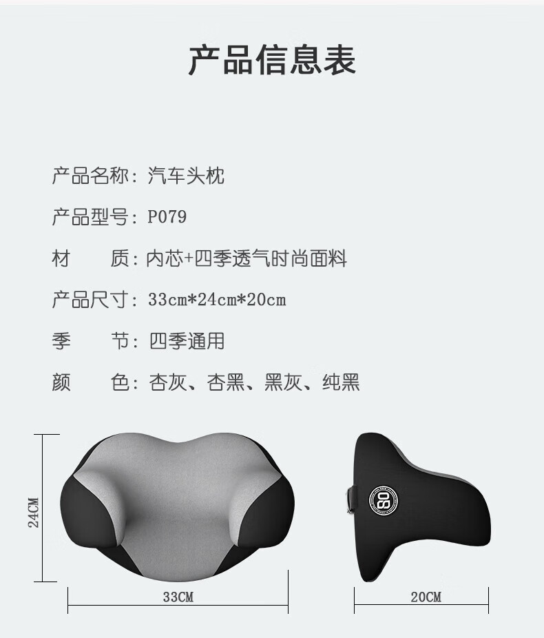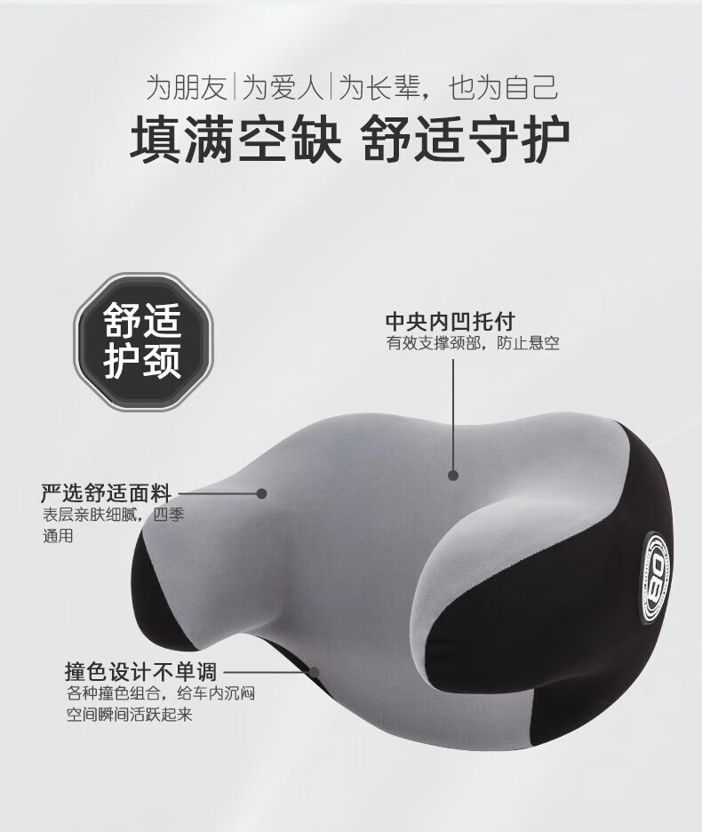 全曲面、贴合腰颈,舒适减压,全新一体化全曲面枕面设计,使贴肤面料易打理,品尚车居公司版型设计师对枕面加以改进,使枕面线条圆润,减少多余棱角。升级舒适体验,肩颈部皮肤对面料要求高,枕面严选柔软的透气面料,呼啦呼啦透气与柔和亲肤并重,在面料中混纺嵌织导电纤维,提高织物回潮率、降低绝缘性,加速静电泄漏。长效保持汽车头枕干净清爽。