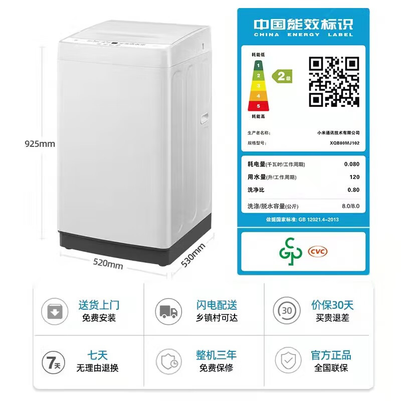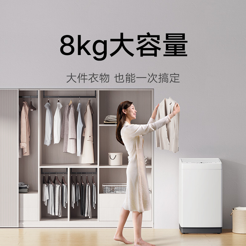 MIJIA 米家 XQB80MJ102 定频波轮洗衣机 8kg 独特设计的波轮配合特定转停比,形成强劲蝶形水流,托举反转衣物,在将衣物洗干净的前提下,减少衣物的缠绕与磨损,减轻衣物褶皱。