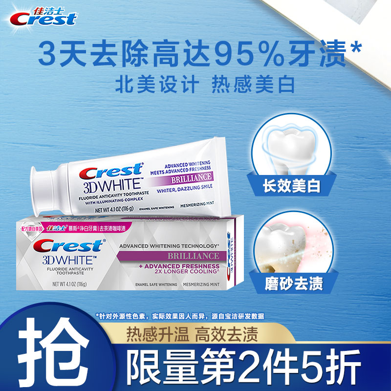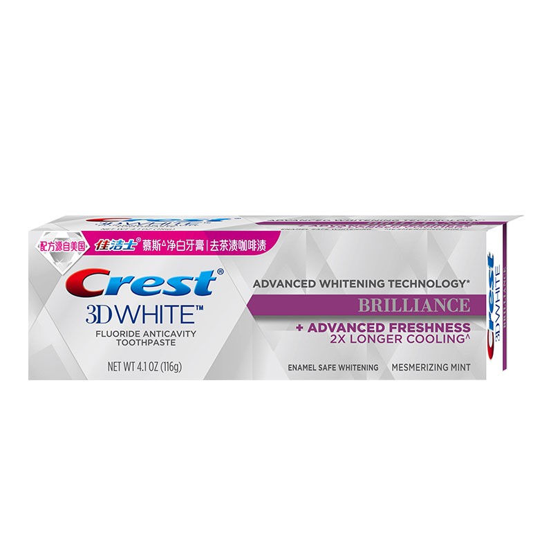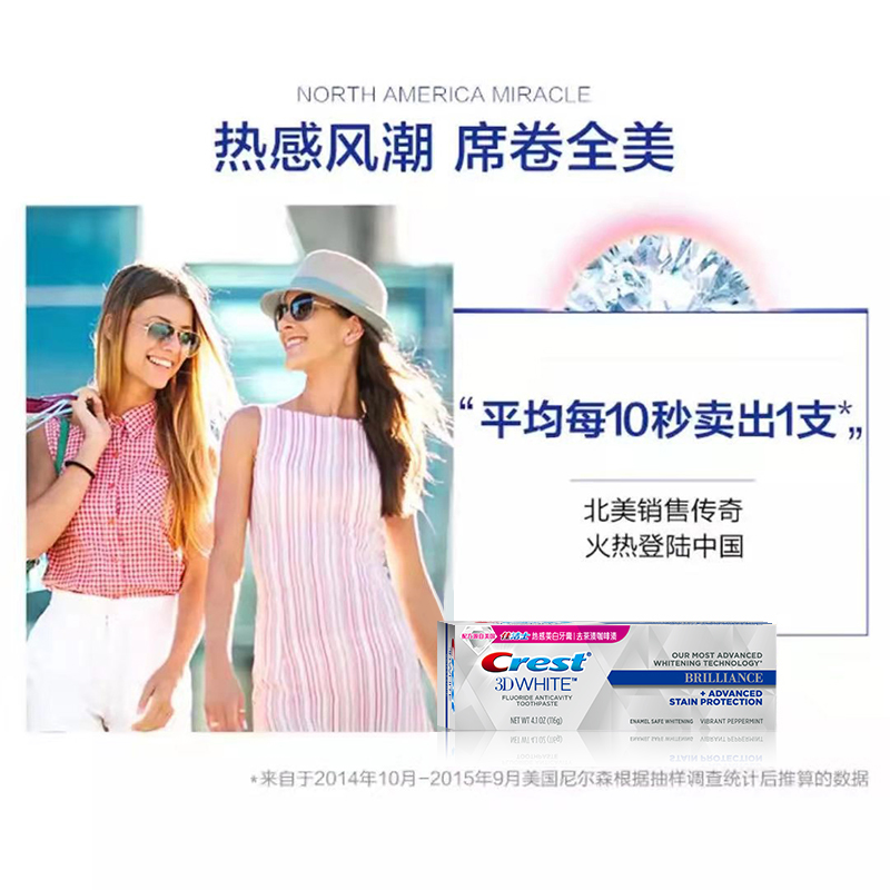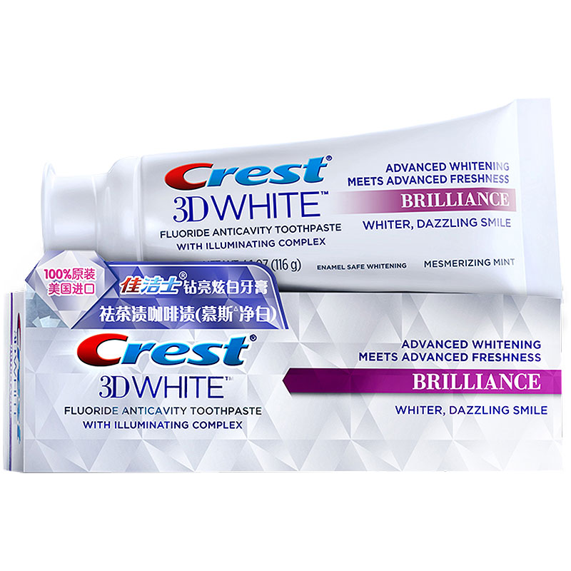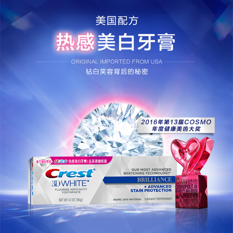 此款3D钻亮炫白牙膏,美国进口,在北美非常热销的一款单品,据说维密的超模们人手一只。清新简洁的白蓝配色,翻盖挤压有效避免浪费和污染。泡沫细腻很容易冲漱干净。这是一款创新热感美白牙膏,采用的Microheat Tech微热技术,使得刷牙时能产生热感,有效软化顽固牙渍,而含有的Glass-H磨砂粒子连续使用也可以针对外源性着色进行有效去除。规格116g。
