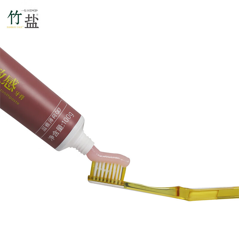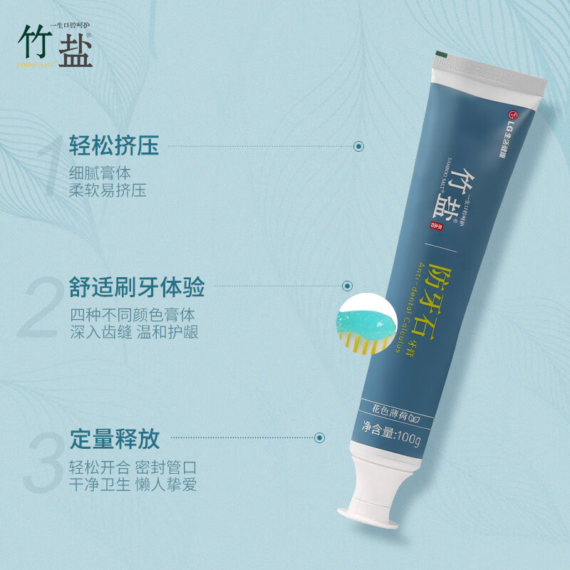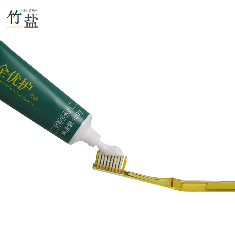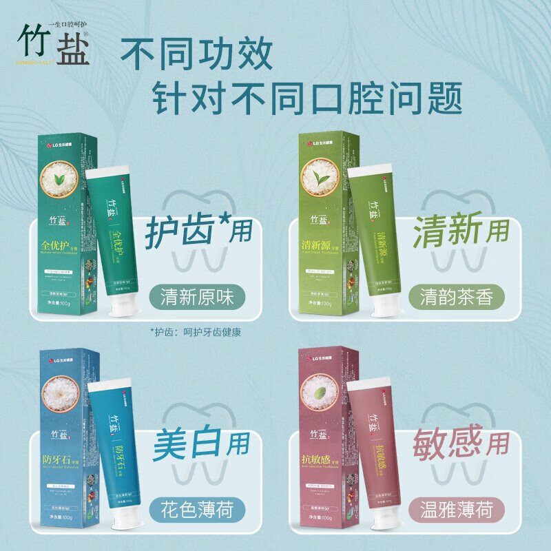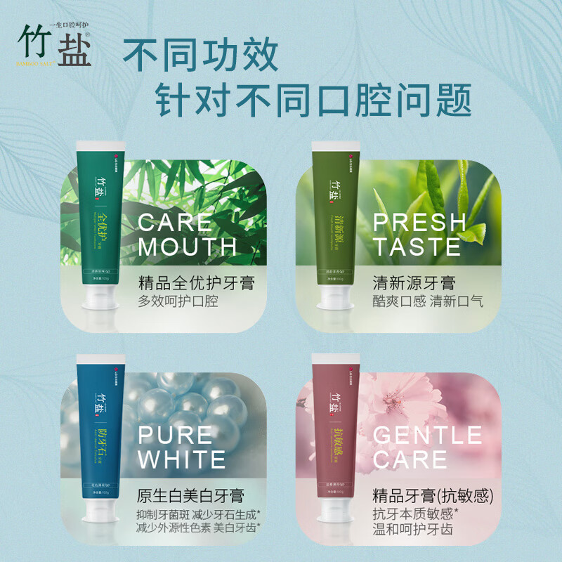 竹盐这款匠心专研系列牙膏套组,内含多效护理、清新茶香、美白防牙石、抗敏感四款牙膏。多效护理牙膏,蕴含水合硅石、单氟磷酸钠、碳酸钙等成分,温和去除牙渍污垢,多效呵护口腔;清新茶香牙膏,含维生素B6,高颜值绿色膏体,酷爽口感,口气持久清新;美白防牙石牙膏,蕴含Zeplite M颗粒、珍珠粉,帮助抑制牙菌斑,减少牙结石生成,抵御外源性染色,牙齿持久亮白;抗敏感牙膏,添加植物纤维,减少牙膏中的摩擦剂,帮助抗牙本质敏感,温和呵护牙齿。