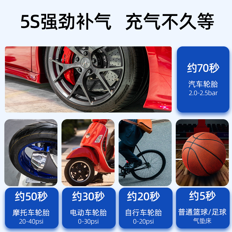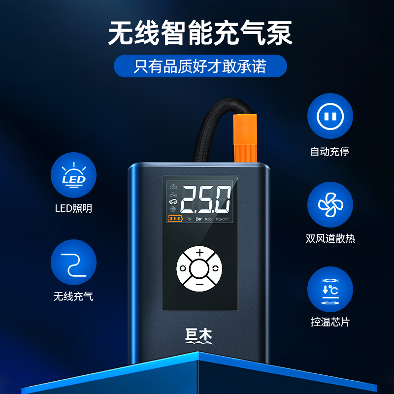 小巧便捷灵活收纳,手掌大小,车内随处可放。晚上充气或特殊情况可长按开关键开启照明。三重降温科技,充气不发烫。自己动手告别拖车预设胎压精准充气充满自停。