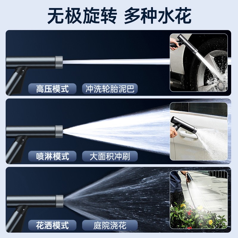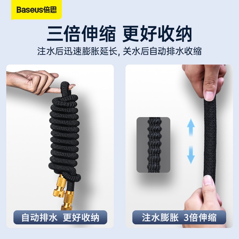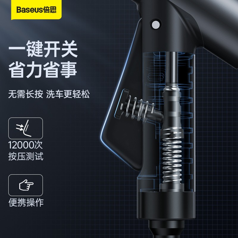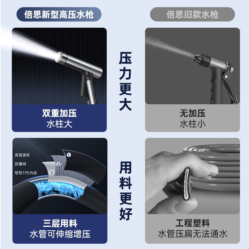 倍思简生活汽车高压洗车水枪采用新型增压软管,TPE一体成型,未注水时柔软、弹性大,可轻松收纳,注水后管身延长变硬,开始增压。枪身采用铝合金材质,持久耐用,高压水流经过不怕变形走样,水枪开关经过5000次按压实测,使用寿命长,枪头无极旋转改变水花形状,适用不同洗车场景。