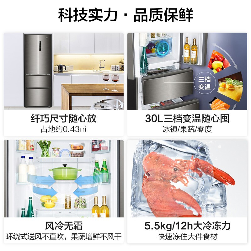 这款海尔BCD-328WDPD多门冰箱采用变频压缩机及风机的双变频组合,温度浮动更小,运转平稳,节能省电,风冷循环,采用法式对开门设计,冷藏室181L,内置T·ABT净味杀菌功能,变温室30L,支持果蔬、冰镇、0℃保鲜三档变温调节,冷冻室117L,双层直开设计,可容纳更多大型食材,冷冻能力5.5kg/12h,综合耗电量0.65kw,新国标一级能效,拉丝材质面板,整体尺寸为681.5* 640*1804mm