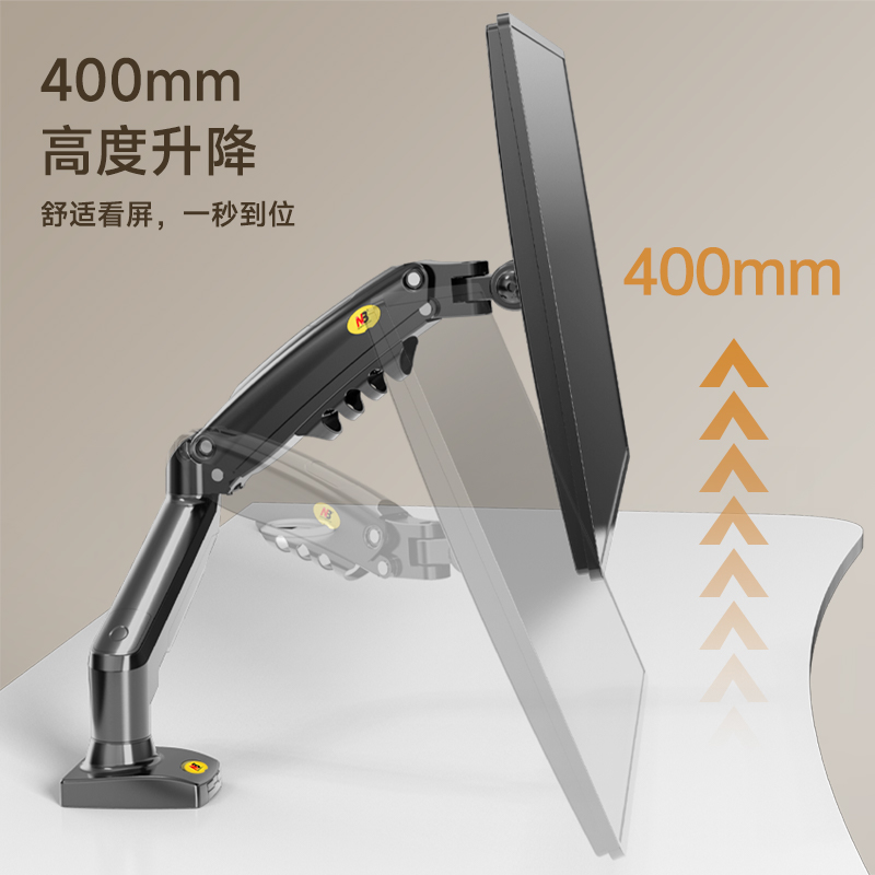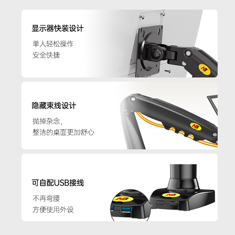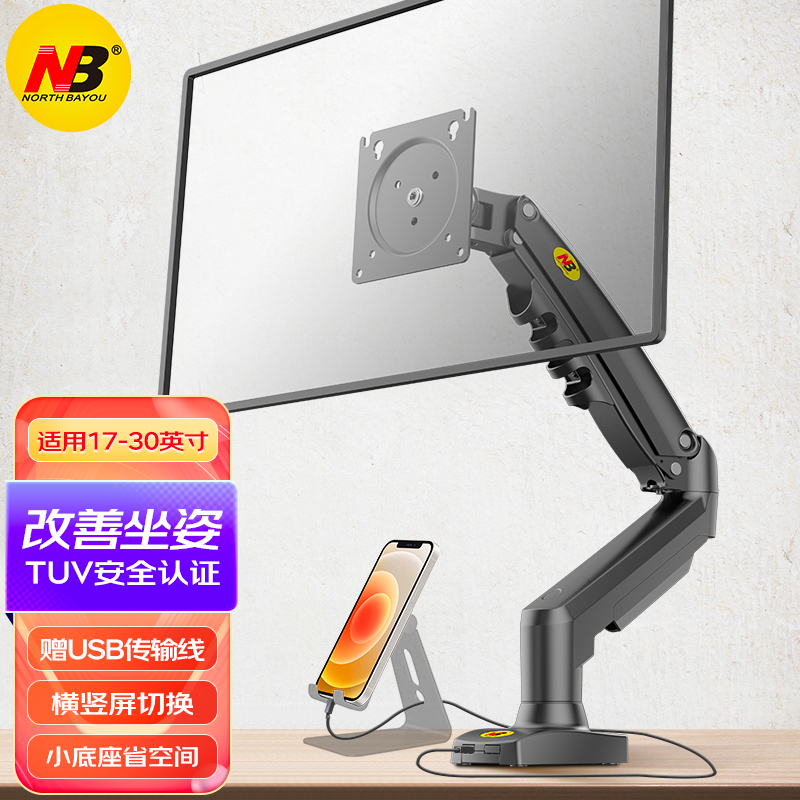 NB F80是为17英寸-30英寸设计的一款显示器支架产品,铝合金材质,支持VESA 75*75和100*100背挂式标准。俯仰角度+35°/-50°,承重2.0~9.0Kg,支持桌夹式安装和孔式安装。