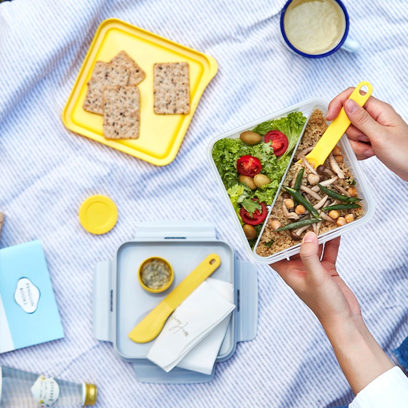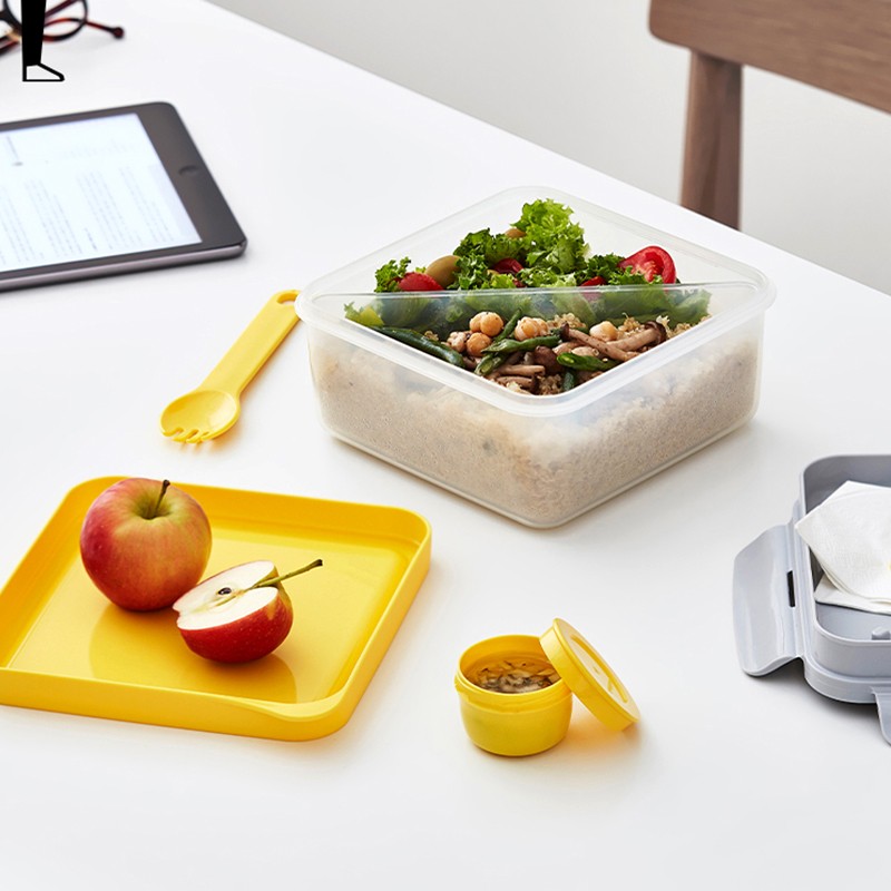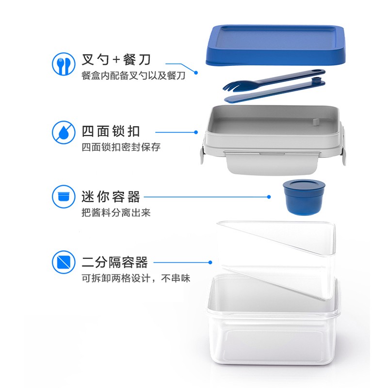 方便携带,密封防漏,餐盒内单独配备了迷你酱料容器,清洗方便。餐盒可拆卸两格设计,不串味,良好的密封性能和体贴的结构,耐热温度-20℃-100℃。