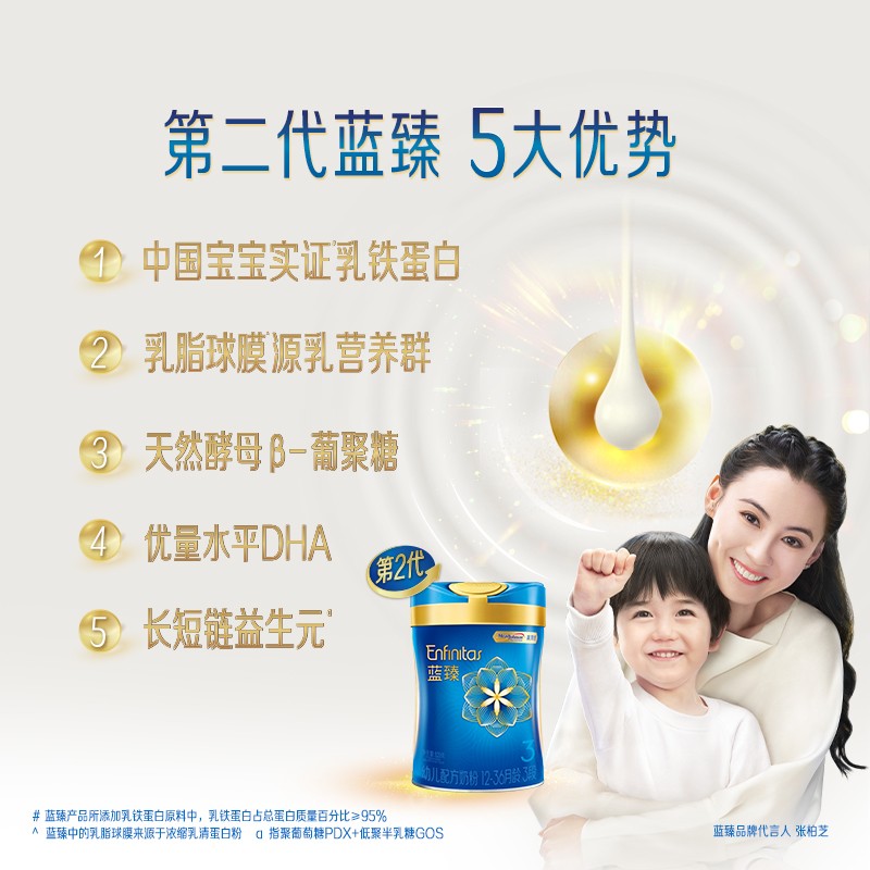 蓝臻,是美赞臣集团旗下的的高端奶粉,因奶源优质和20倍乳铁蛋白的优点,价位稍高。市面上有国行版、港版、美版,国行版蓝臻的奶源来自荷兰。对比美赞臣其他款奶粉,蓝臻以高含量的20倍乳铁蛋白为宝宝的健康成长保驾护航,每100g奶粉乳铁蛋白含量高达330mg,冲调后600mg/L,贴合宝宝天生需求。含有独特的短链+长链独特益生元组合,能够全面保护宝宝的肠道,增强宝宝自护力。此外,乳铁蛋白还与蓝臻中独特的益生元组合相互结合,配合PDX+GOS益菌素组合,双重助力宝宝的健康,让宝宝消化吸收更好,排便软且轻松。MFGM与DHA双重脑动力营养组合,可提升2倍脑洞力,研究发现:MFGM(乳脂球膜)对于婴幼儿的神经发育、代谢调节、抗感染等都具有重要作用,DHA就是咱们俗称的脑黄金,是大脑和视网膜的重要构成成分,对宝宝的智力和视力发展相当重要,这二者联手,双重功效支持脑细胞连接,帮助大脑发育。