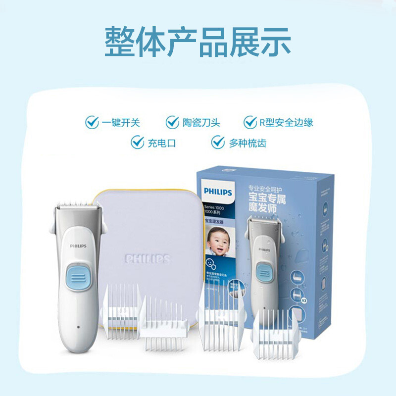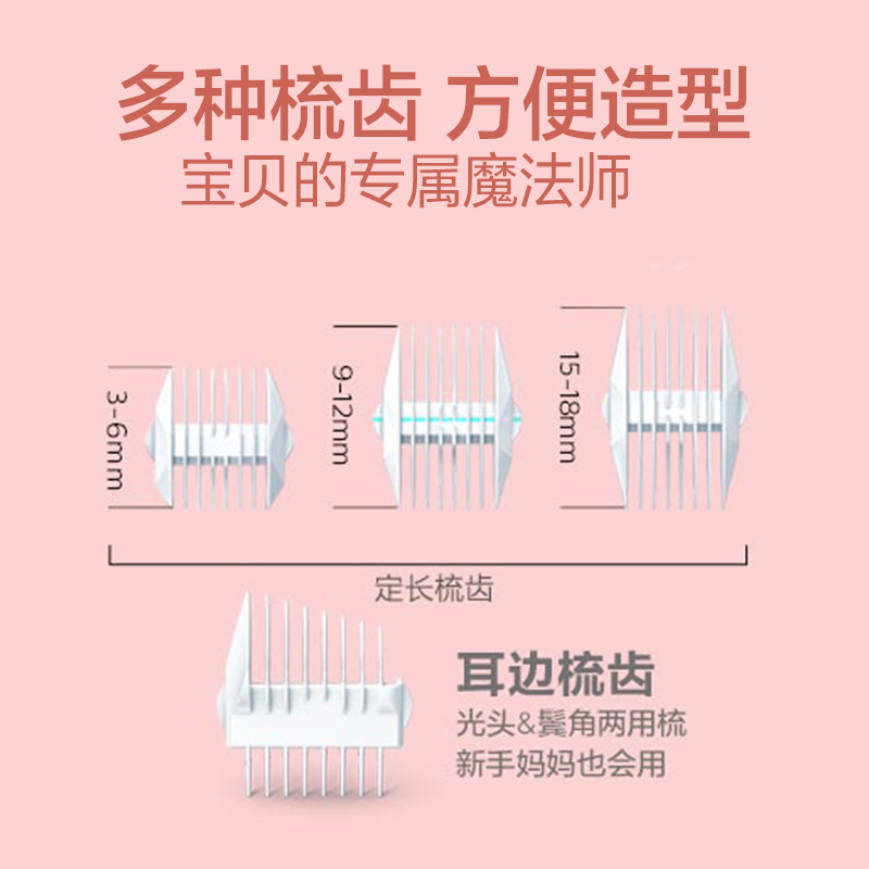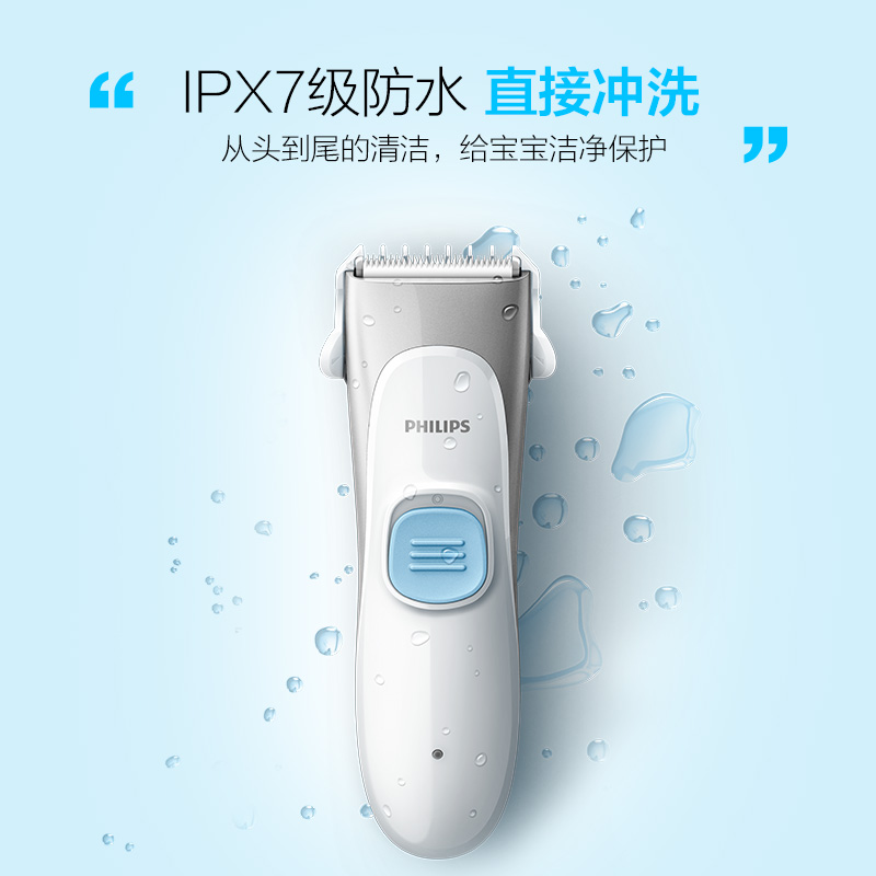 安全陶瓷短刀片和圆润齿形设计柔和贴近头皮,宝宝乱动也不怕,IPX7级防水直接冲洗,从头到尾的清洁给宝宝洁净保护。