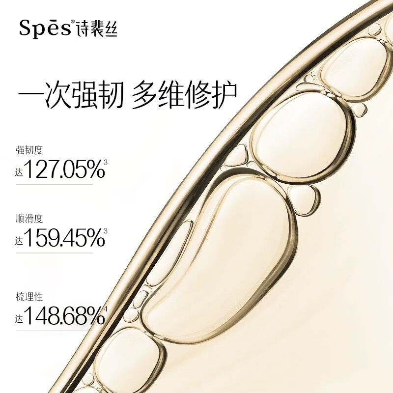 法国珍稀黑松露精华,补充发丝蛋白,修护受损发丝,8重天然植物精油,含摩洛哥油等8重天然植物精油,一抹柔顺盈亮发丝,运用了Spes诗裴丝独家二硫键重构技术。简单的说,二硫键是维持头发弹性和形状的重要结构,头发出现毛糙、分叉,尤其是经过染烫漂的头发会出现干枯、脆弱易断的问题,主要是由于头发中的二硫键损伤断裂。而二硫键重构技术类似“头发接骨神器”,使用后能够让修护发芯,让发丝更加柔顺。
