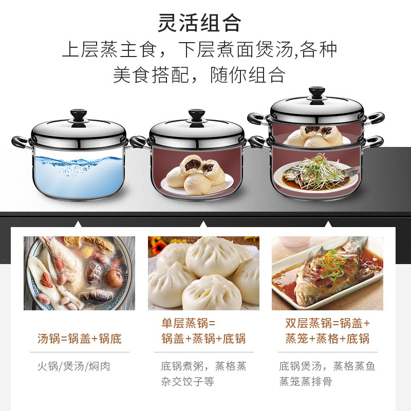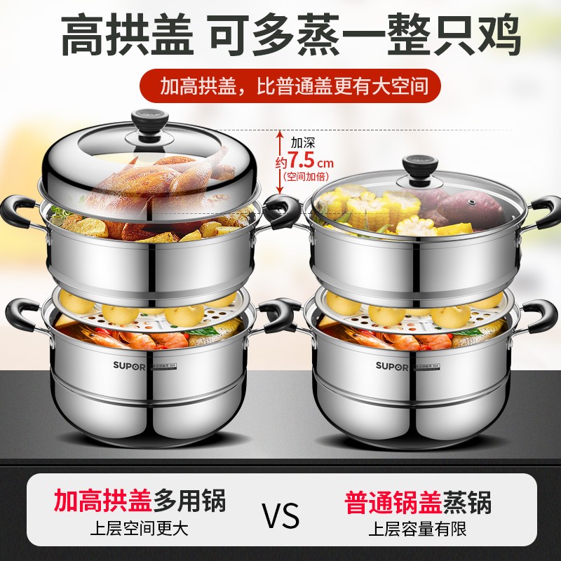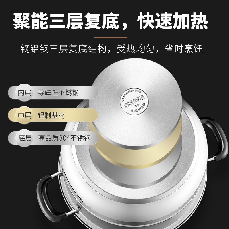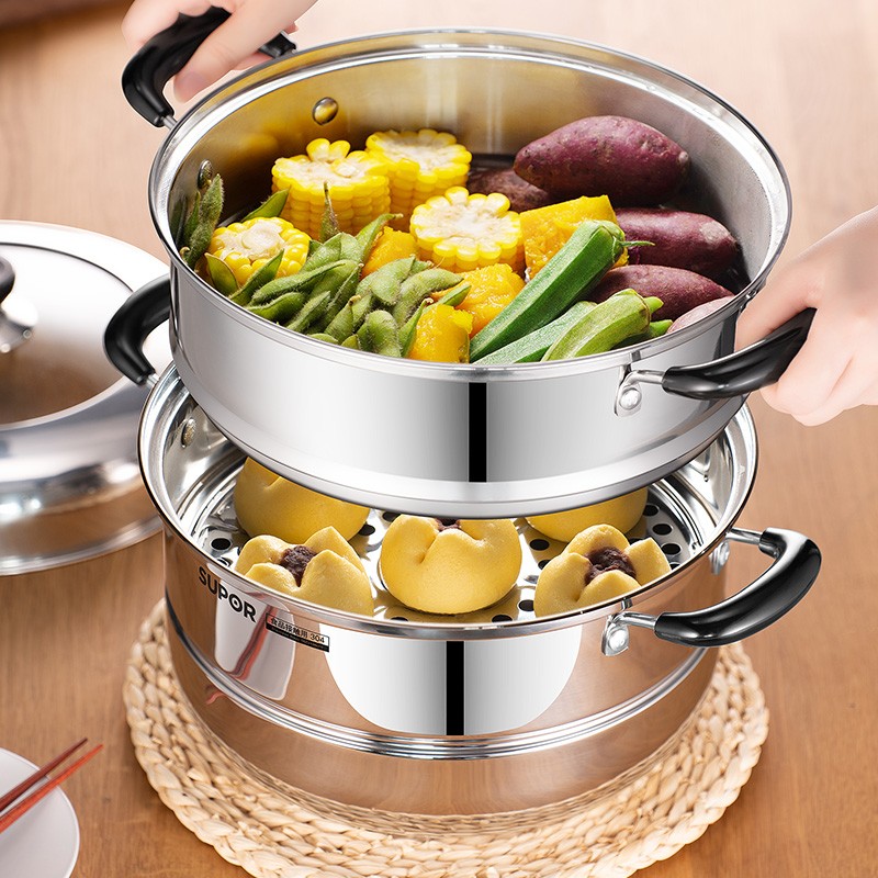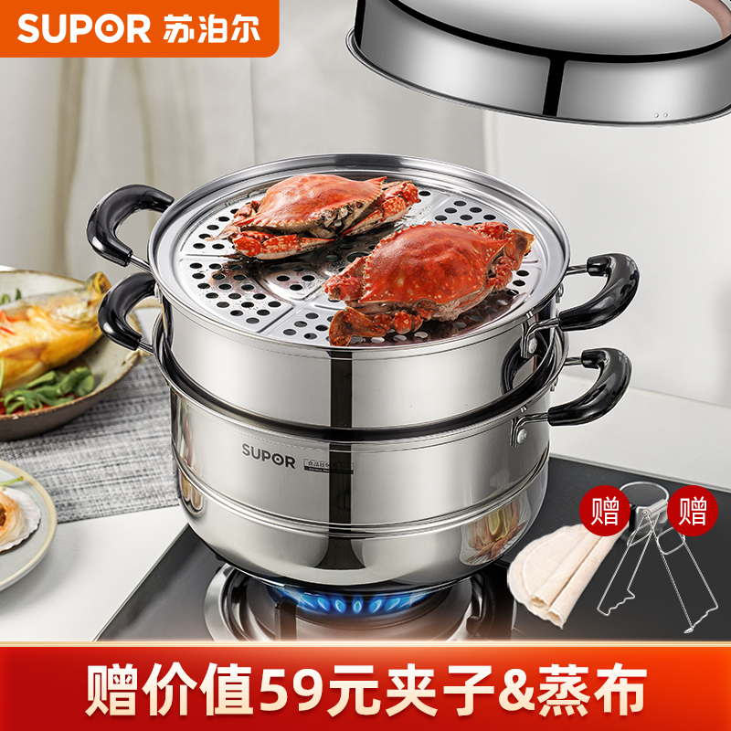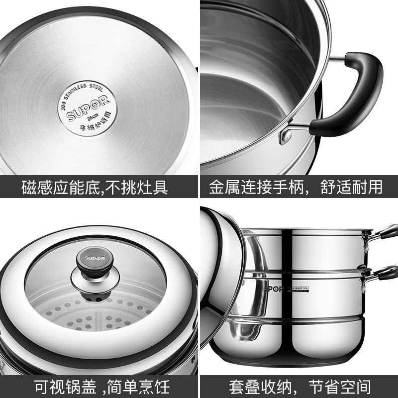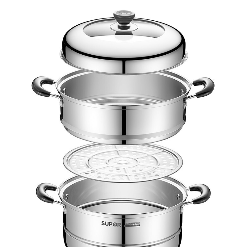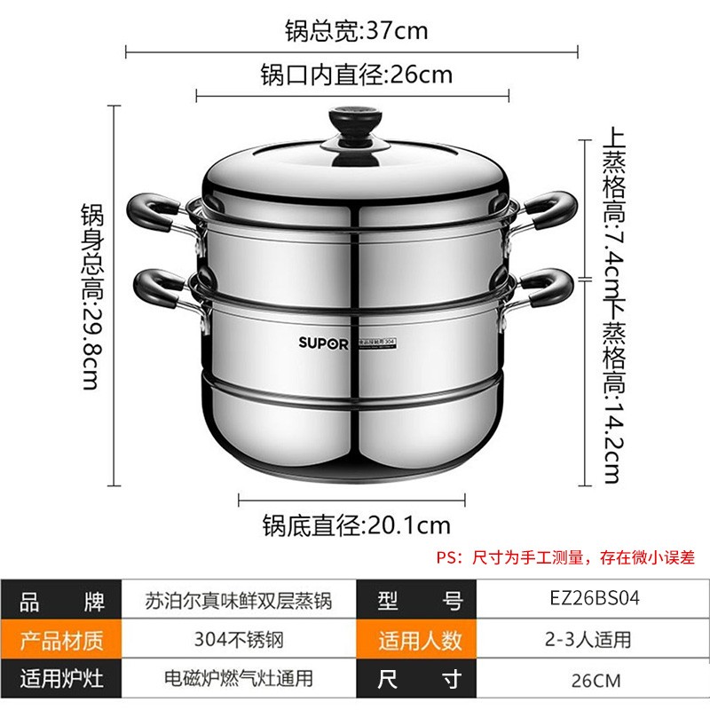 SUPOR 苏泊尔 EZ28BS04 不锈钢双层复底蒸锅 ,此款苏泊尔蒸锅采用食品级304不锈钢材质,加厚锅壁加倍结实耐用,内口径28cm,双层设计适合2-5人使用,适用于多种灶具,分离式蒸格,蒸汽快速循环食物熟的更快。