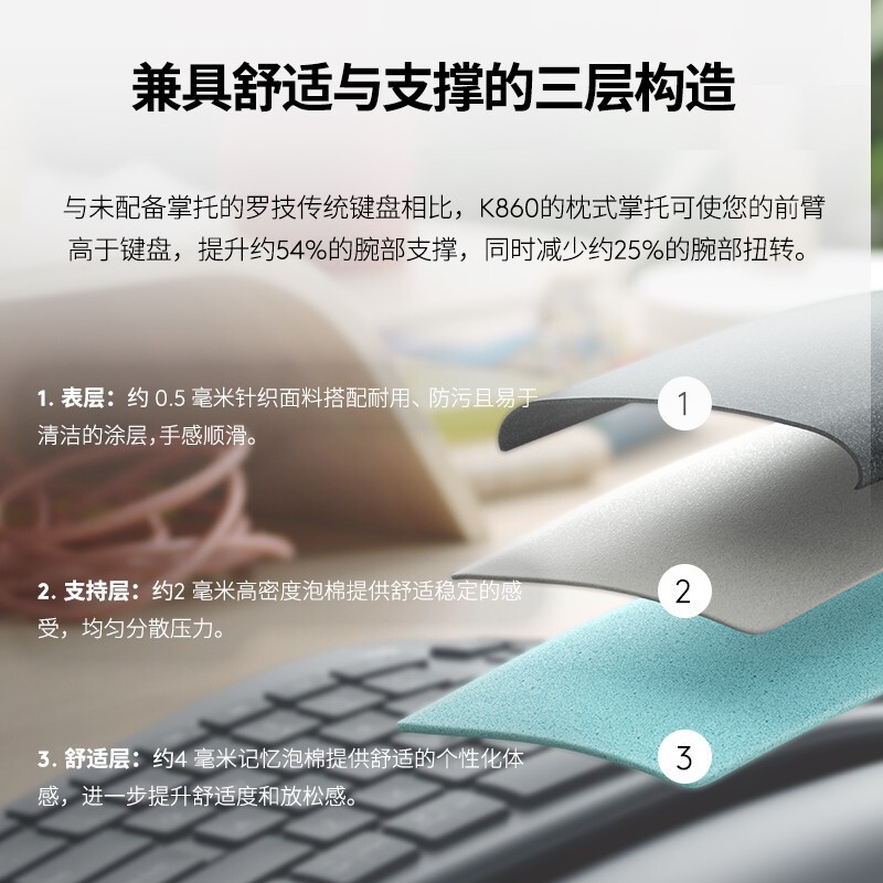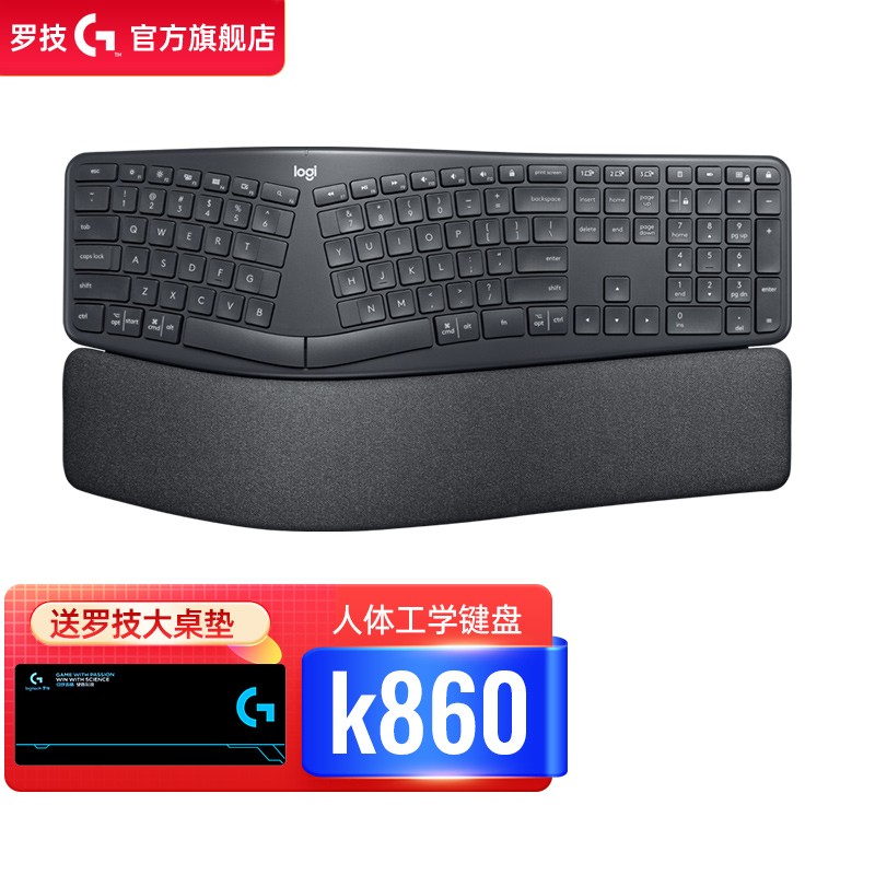 罗技(Logitech)这款108键无线薄膜键盘,整体弧线设计,符合人体工学,可减少约21%斜方肌上部肌肉活动。配备枕式掌托,使前臂高于键盘,提升腕部支撑和减少腕部扭转,体验舒适。最多可以配对三个设备,一键可轻松切换配对设备。