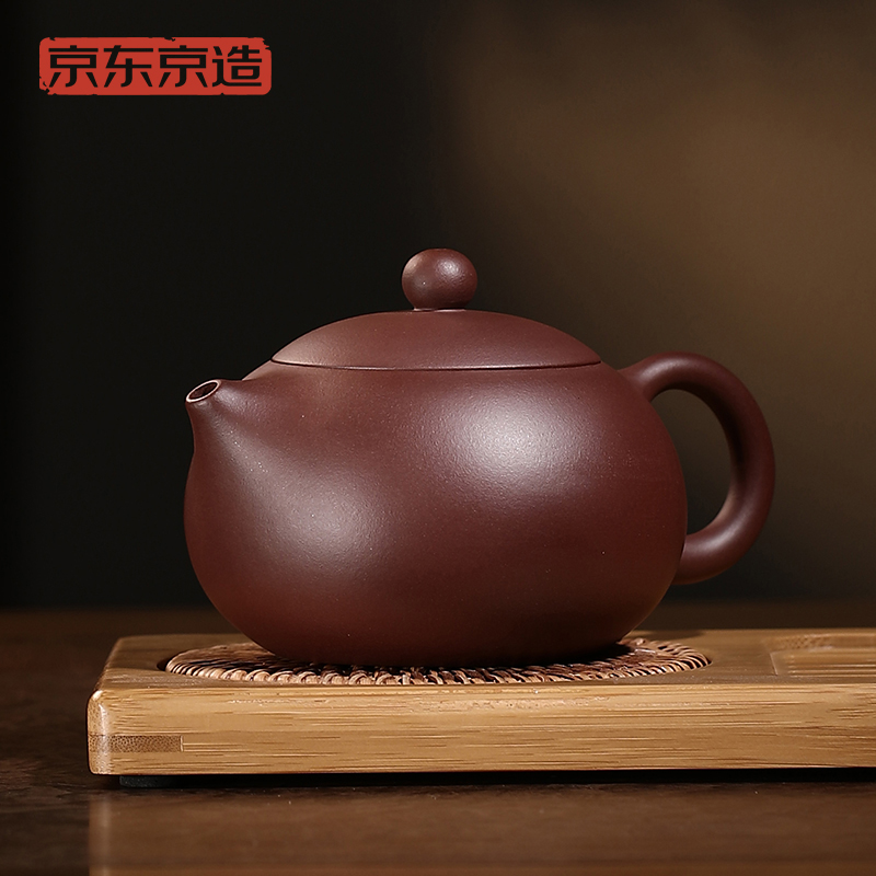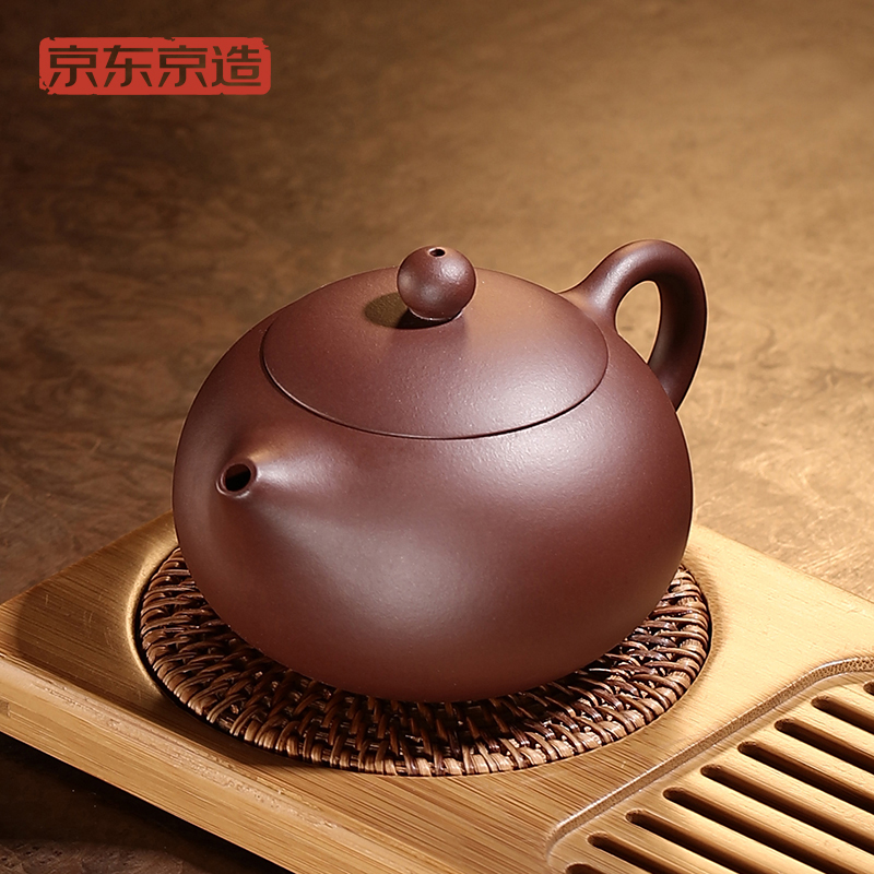 紫泥泥料较为醇厚,可塑性较好,烧成温度范围较宽。烧制出来的壶呈棕紫色调,烧成后呈紫黑色调,在强光下,微微泛棕红色,表面细腻光润,色泽纯正。紫泥矿料含铁成分较高,收缩率约为119%,双气孔结构明显,耐高温,烧成稳定性好,适合泡轻烘焙类的乌龙茶以及普尔等各类茶。