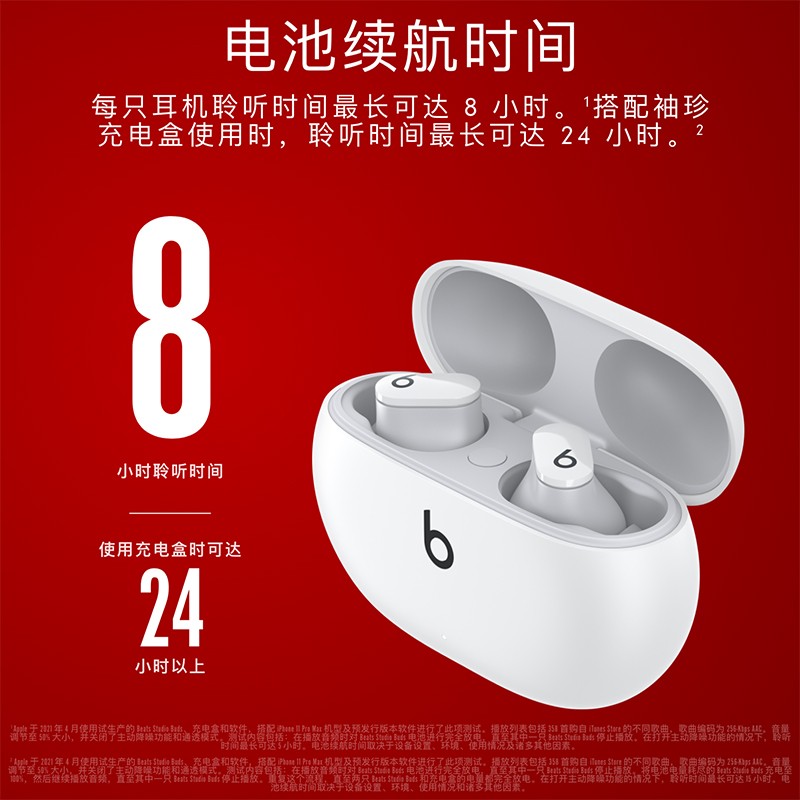 续航方面,耳塞提供预计可达8小时的聆听时间,配备的袖珍充电盒支持额外充电两次。两者结合, Beats Studio Buds可提供预计可达24小时的播放时间。
