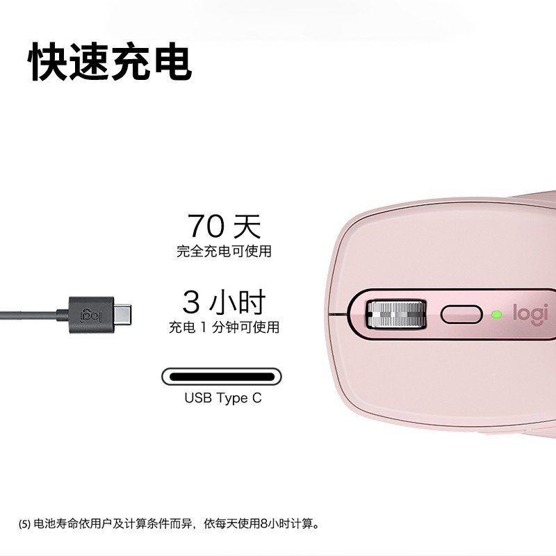 罗技(Logitech)这款鼠标,采用Magspeed电磁滚动技术,将速度、精度和静音结合。采用500毫安可充电锂离子电池,1分钟快速充电可持续使用3小时,充电完成后可使用长达560小时,使用的USB-C线缆可以在充电时办公。传感器支持最大4000DPI,DPI可调范围200-4000,可以50DPI为增量进行设置。