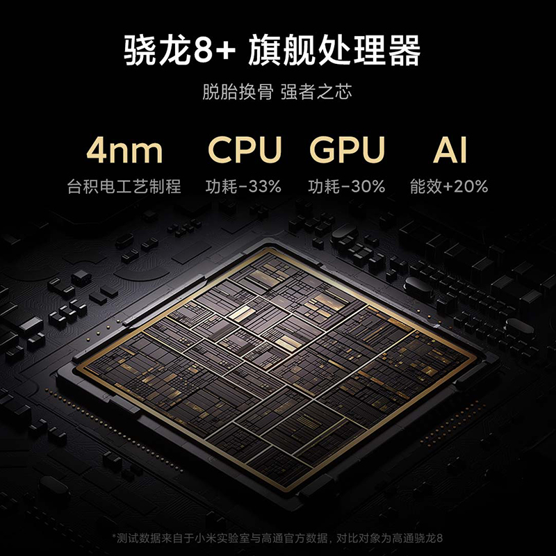 性能方面,搭载高通骁龙8+ Gen 1处理器,采用4nm工艺制程,由1超3大4小的核心组合配置,超级大核主频高达3.2GHz,3颗大核主频为2.5GHz。搭载 FBO 焕新存储技术。已被闪存全部主流品牌采用,并被纳入下一代 UFS 4.0 国际闪存标准。该技术在 UFS 存储芯片中自动检测、自动整理手机存储碎片。模拟 4 年使用测试,读写速度几乎无衰减。搭载的小米动态性能调度技术,实时智能预判画面及操作,调整骁龙8+激活核心数量、频率及屏幕刷新率,让骁龙8+的性能收放自如。