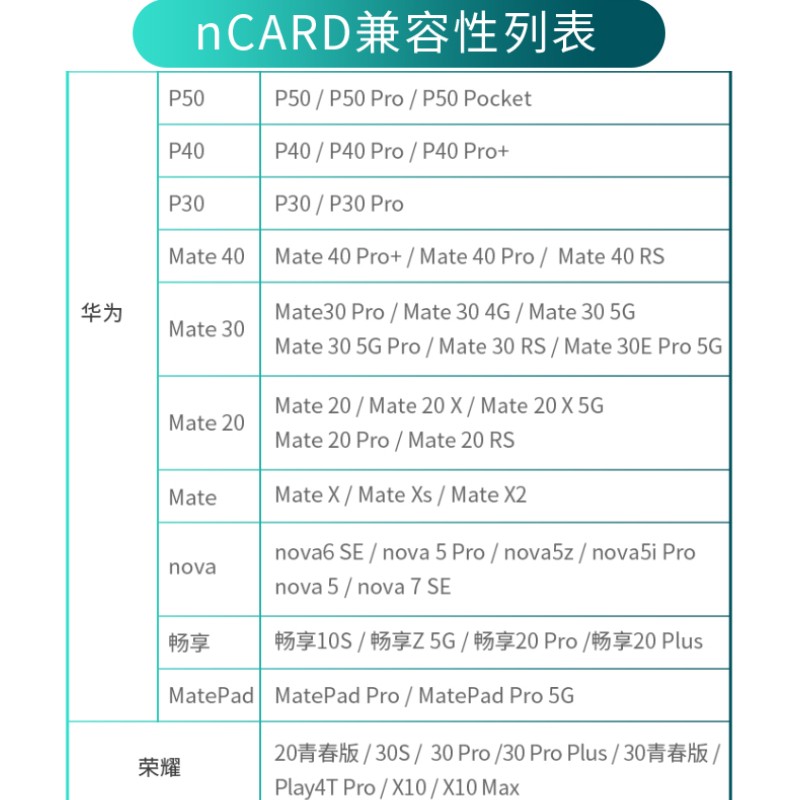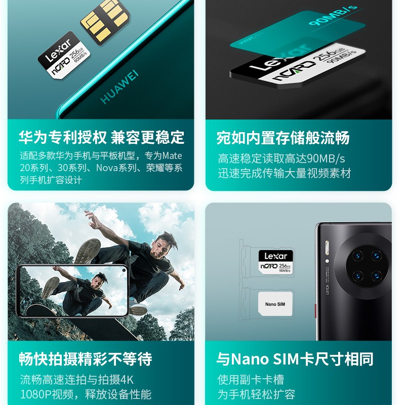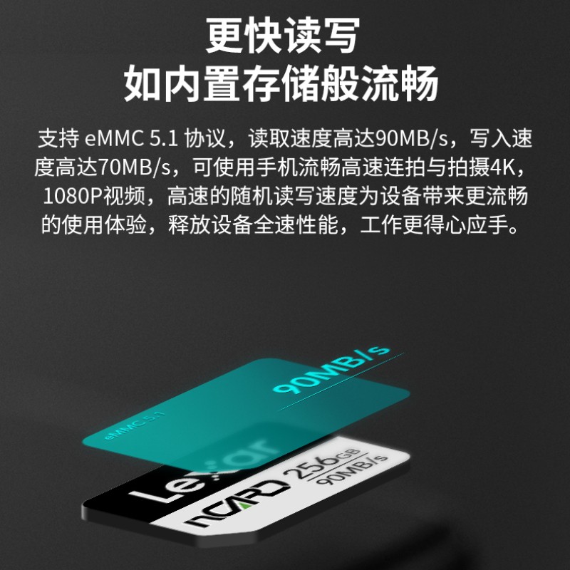 nano SIM卡同尺寸,支持eMMC 5.1协议,读取90MB/s,写入70MB/s,适配华为手机与平板机型,提供64-256GB多种容量存储空间。