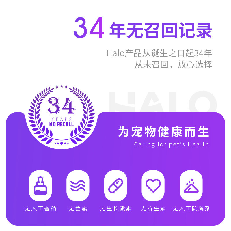 这款猫粮,精选野生鱼肉,肉粉包括动物的骨骼和皮毛是传统宠物食品作为降价成本的常见手段,这些成分阻碍宠物对营养的吸收,不利于消化,halo只使用纯整的鲜肉作为原料,拒绝任何形式的肉粉添加,提高吸收率,避免软便,增强体质。