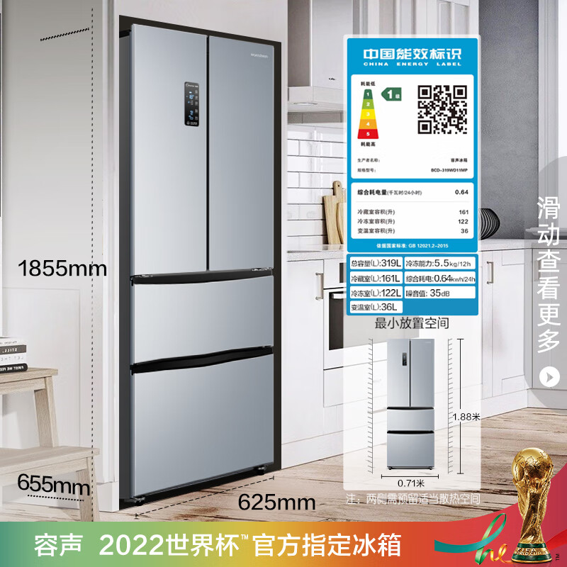 容声(Ronshen)的这款型号为BCD-319WD11MP的多门冰箱,其采用了自家独有的矢量双变频技术,一级能效,更加节能和静音;多格局的设计,满足生活所需,防止食材串味;还有灵活宽温抽屉,三种模式调节;AIF抑菌除味技术,为食材营造纯净的储存环境;风冷无霜,均匀制冷;电脑温控,五种智能模式。产品尺寸:625*680*1809mm。
