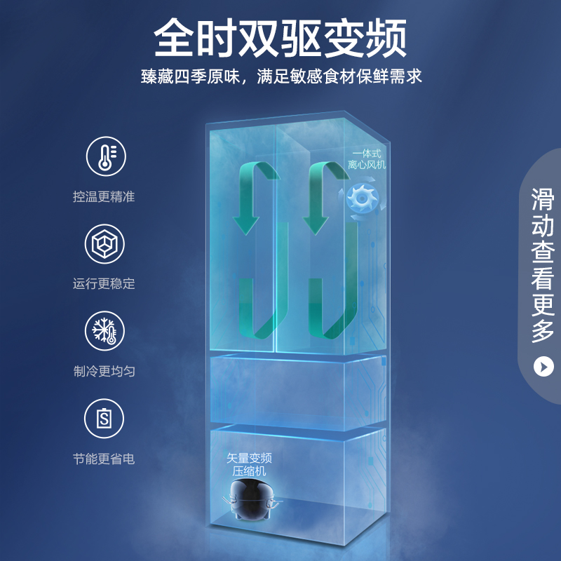 冰箱采用多格局设计,营造精准的恒温空间,让每一份食材都被精心呵护。搭载矢量变频压缩机,温度波动小,保鲜效果好。更有净味系统,时刻保持箱内空气清新。