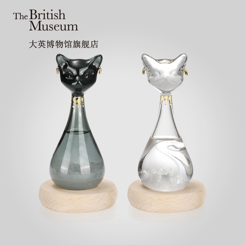大英博物馆这款盖亚·安德森猫风暴瓶,主体选用高硼硅玻璃烧制而成,表面细腻温润,富有光泽。猫头形象设计,将萌趣与妖娆结合为一体,将妩媚与高冷的气质逐一展现。瓶内结晶将根据天气变化变换形状,起到模拟天气温度的作用。底座选用榉木材质制成,耐摔耐磨,经久耐用。