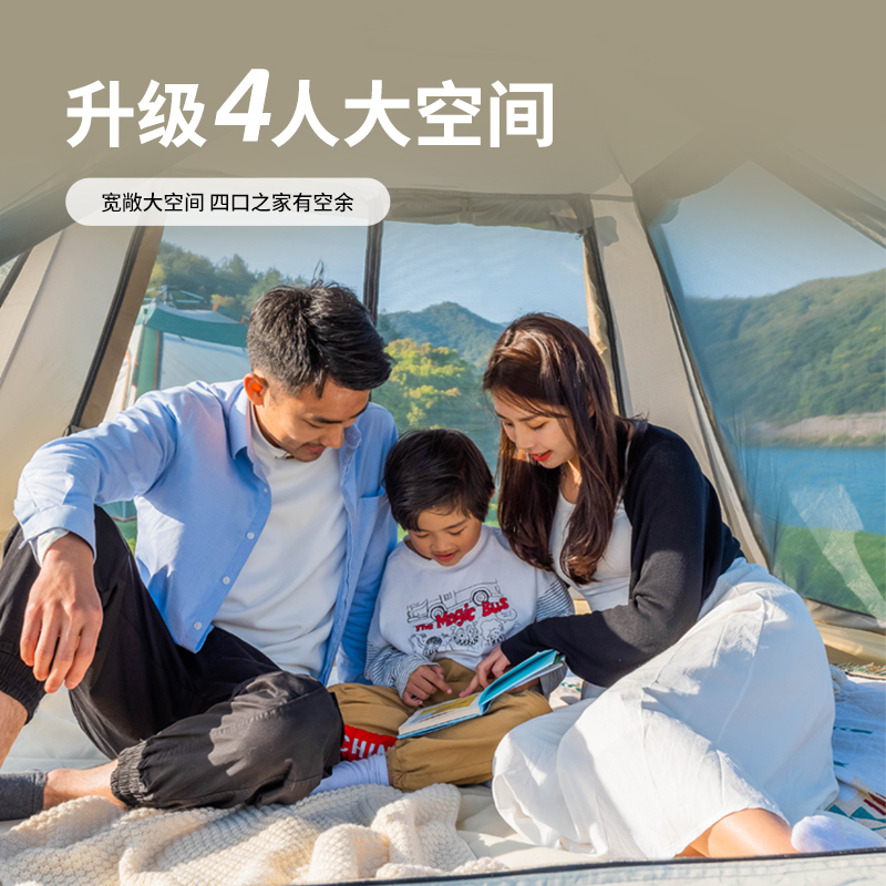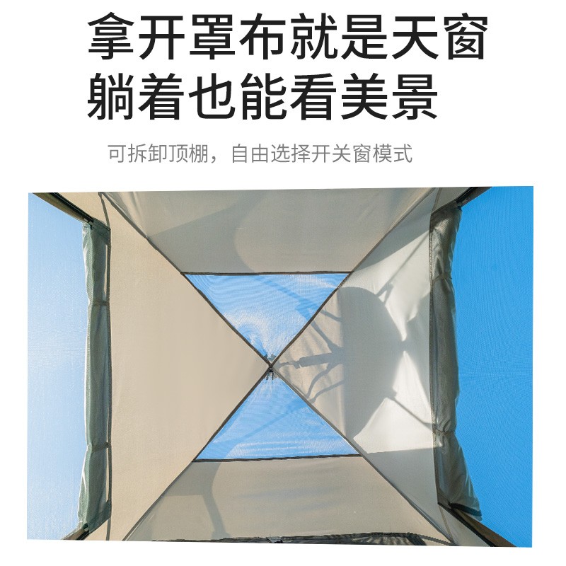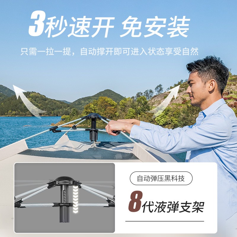 自由客(ZIYOUKE) ZYK-破晓 户外全自动帐篷,采用全自动支架设计,8代液弹支架,一提即开,加大遮阳门厅设计,大大增加遮阳防雨活动空间,前后门厅都可撑开,3-5人加高帐顶,内部大空间,近5㎡的大帐篷,可拆卸顶棚,全封闭防雨设计,有效保护帐内不被雨水侵入。银胶防晒涂层,有效防止紫外线照射,UPF50+。