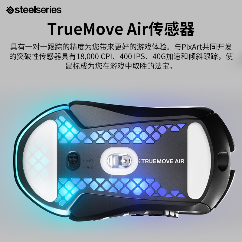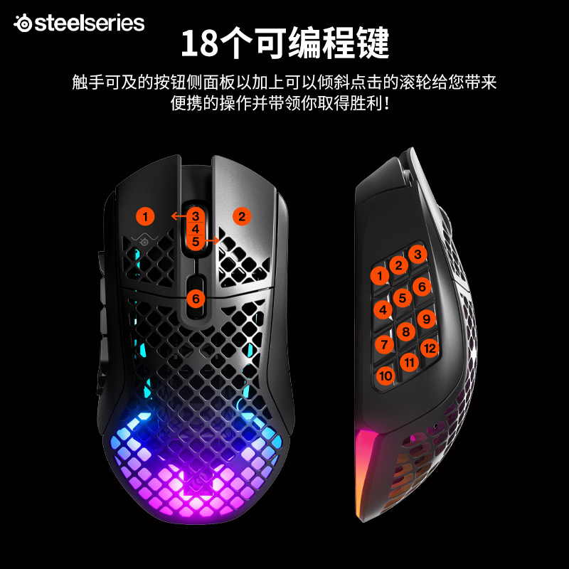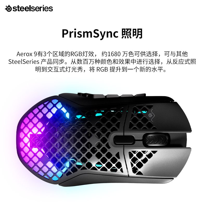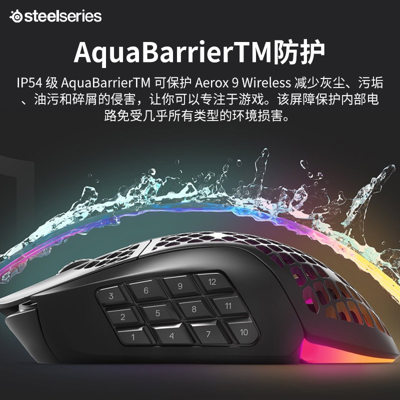 赛睿 Aerox 9 Wireless游戏鼠标采用轻量化设计,重量仅为89g,拥有18个可编程键,配合自家Quantum2.0 Wireless是无线技术,具有先进的双通道优化功能,传输更稳定。AquaBarrierTM可保护Aerox9 Wireless减少灰尘、污垢、油污和碎屑的侵害。与PxAt共同开发传感器具有18,000CP1、4001PS、40G加速和倾斜跟踪。有三个区域的RGB特效,1680万色供选择。