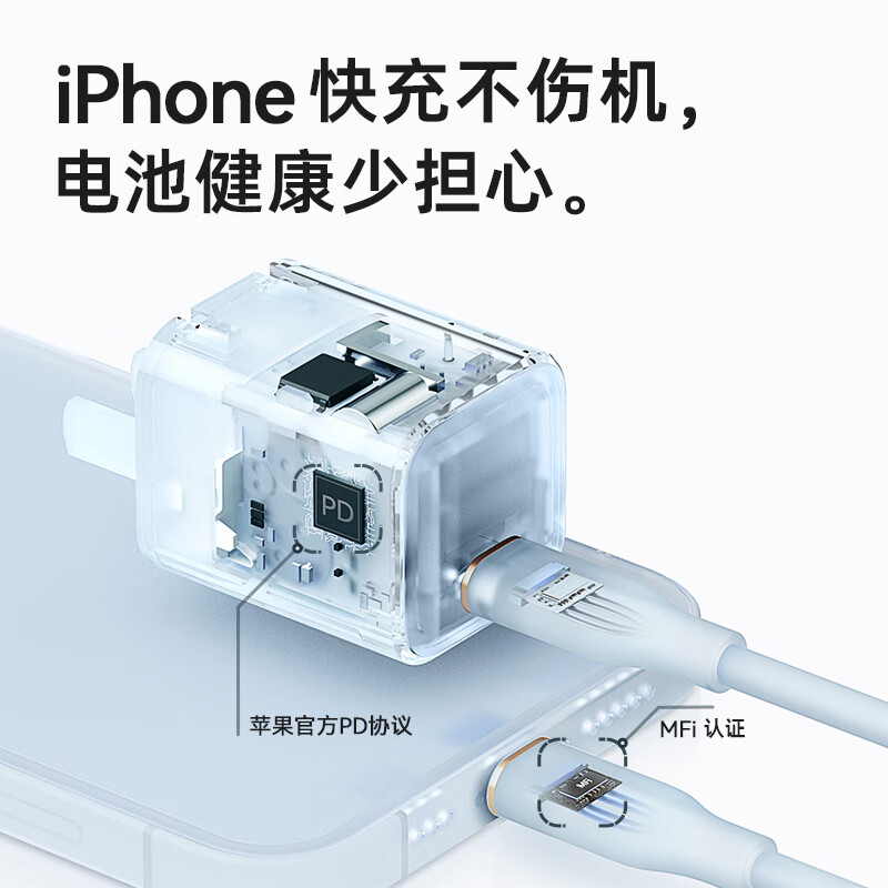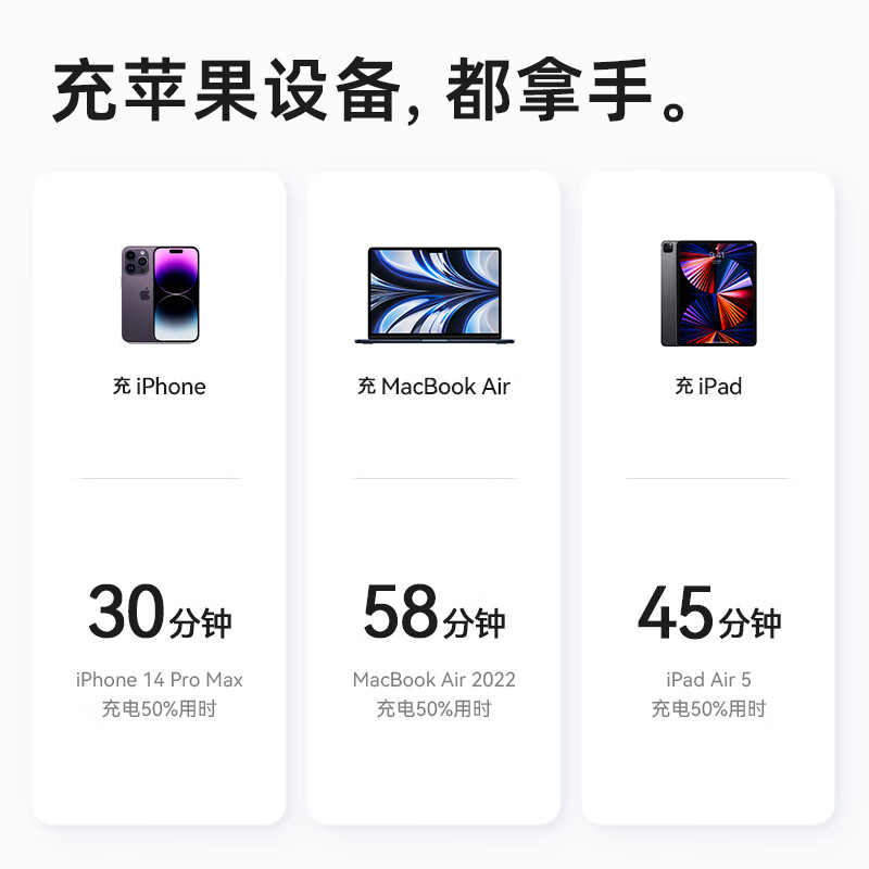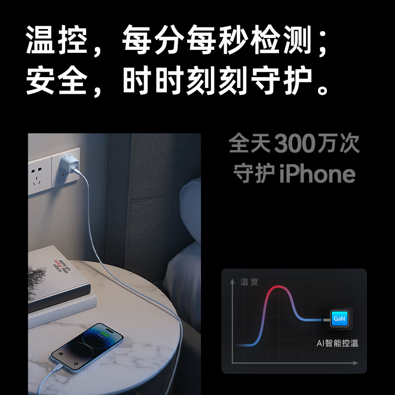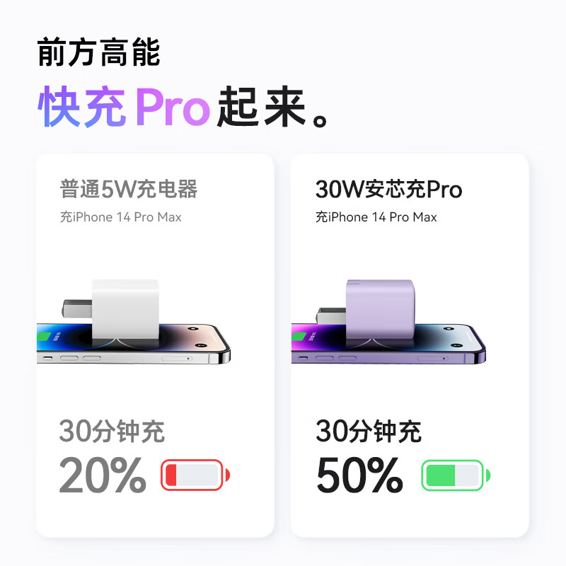 Nano3 30W充电器,依旧是小巧的造型设计,可折叠插脚更方便携带,拥有幻影黑、自然青、丁香紫、晨雾蓝、极光白等多个配色可选。此外,官方宣称新款Nano3 30W充电器30分钟将iPhone 13 Pro Max充至50%电量,并升级了AI温控系统2.0,充电更安心。