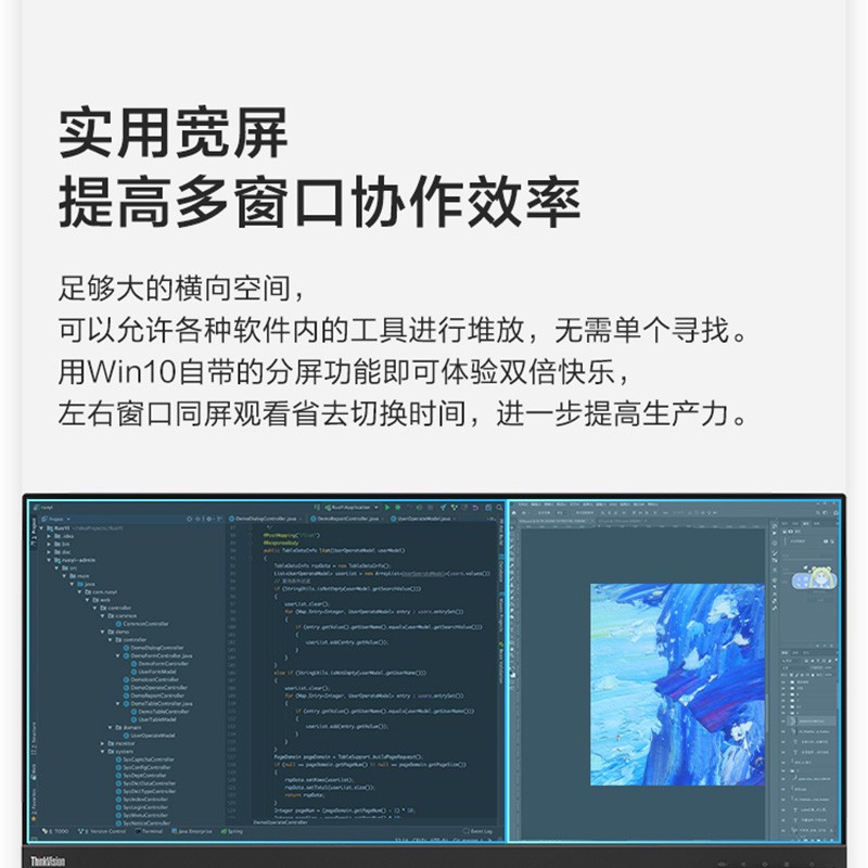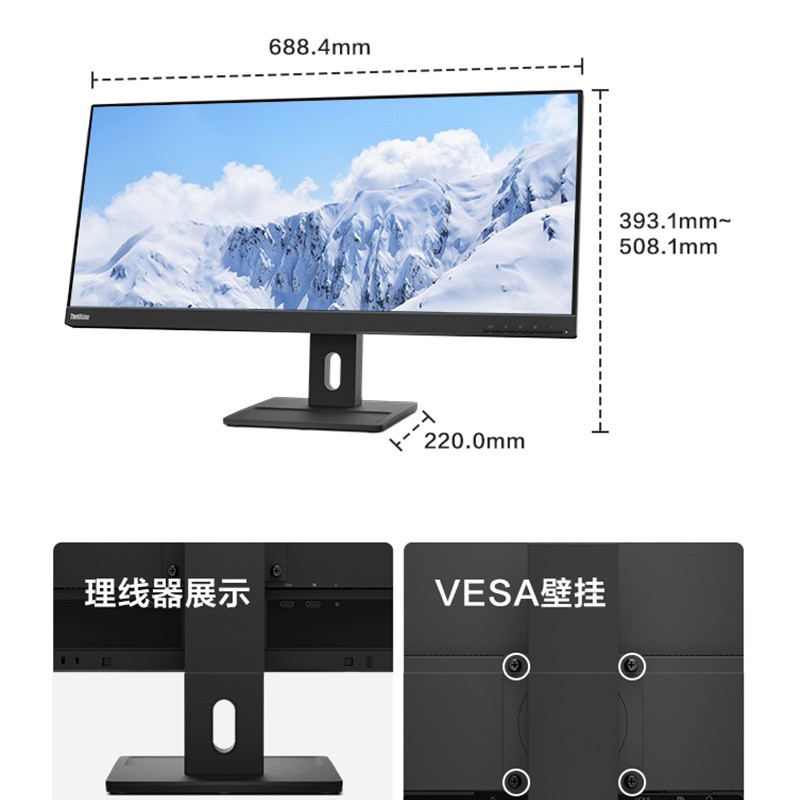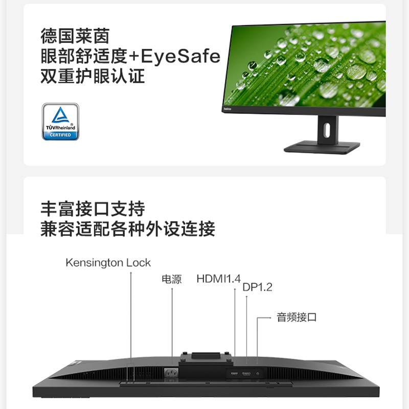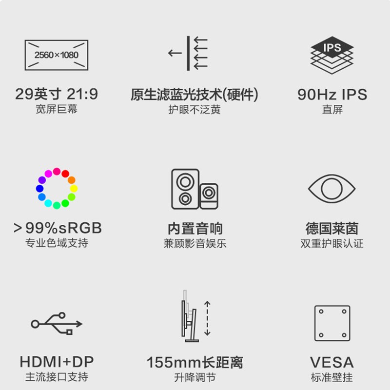 联想 E29w-20 显示器此款显示器为29英寸大小,面板为IPS,分辨率为2560*1080,99%sRGB色域,支持原生硬件滤蓝光技术,双重护眼认证,支持90Hz刷新率,内置2×2W音响,旋转升降底座,可以壁挂。