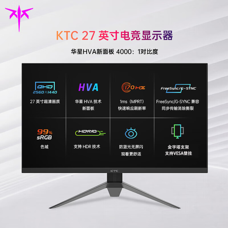 科幻战机造型,背部纹理,金字塔底座,支持VESA壁挂,正面采用一块27英寸华星HVA面板,2K分辨率,3ms响应时间,170Hz刷新率,支持FreeSync/G-SYNC兼容,弱化信号接续,屏幕延迟和图像撕裂情况,狙击准星,增强FPS游戏精准打击度,暗部平衡,高光不过曝,暗部更清晰。HDR10用丰富的画面亮度层次和画面细节,便于发现更多隐秘的细节,DP1.2/HDMI2.0对外接口。