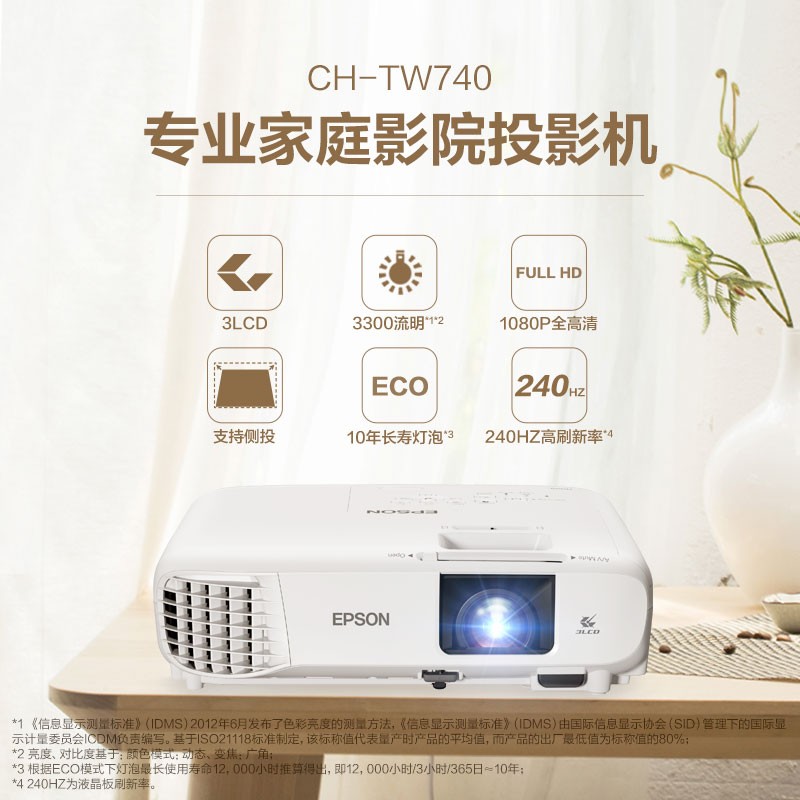 爱普生CH-TW740家用投影机,拥有3300流明的超高亮度,无需再担心明亮环境下环境光对画质的影响,是替代电视的理想产品。 在性能方面,爱普生CH-TW740采用3LCD技术,不仅拥有3300流明的亮度,还有1080p的原始分辨率,同时对比度高达16000:1,保证画面拥有更多的细节表现力。 在画质功能上,这款投影机内置画质增强技术,让画面的细节满满。10bit拥有超10.7亿色彩,让画面的表现更细致。 在功能方面,爱普生CH-TW740在2.68米酒可以投射出100英寸大画面,小户型也可以投射大画面。机器支持水平30度梯形校正,并支持垂直自动梯形校正功能。此外,该机的灯泡寿命在ECO模式下可以长达12000小时。