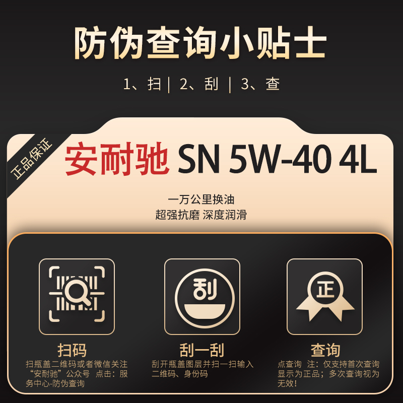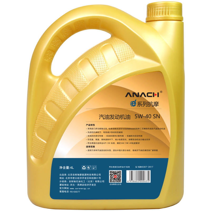 安耐驰公司是一家致力于为中国消费者提供世界一流汽车养护美容产品的专业公司,是美国ER公司、Hi-Gear公司,德国Quixx公司中国总代理。Energy 安耐驰 全合成机油润滑油 SN 5W-40,其中S代表汽油发动机油,N为质量等级,从A开始,字母越靠后,质量等级越高。W前面的数字越小说明低温黏度越低,发动机冷启动时的保护能力越好,W后的数字是机油耐高温性,数字越小,可使用的环境温度越低。
