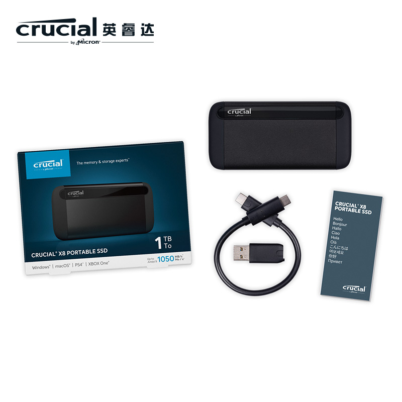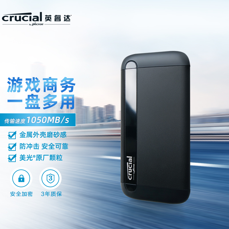 英睿达 X8 移动固态硬盘外壳采用阳极氧化铝单体芯,外观美观,且能有效散热,适用于大多数电脑、平板电脑、手机等,共有500GB、1TB两种容量规格,读取速度高达1050MB/s,提供三年有限质保。