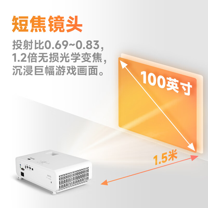 明基 TH690SX 短焦投影仪,全玻璃短焦镜头,无损光学变焦;2300流明,4LED全新光源加持,拥有30000小时光源寿命,相比灯泡投影机,光源寿命2倍升级。投射比为0.69~0.83,1.2倍无损光学变焦,沉浸巨幅游戏画面。支持侧投,自动垂直梯形校正;漫反射画面设计,相比传统电视屏幕,投影出的漫反射画面让肉眼避免直视光源使用投影机长时间游玩对眼睛更友好;环境光自适应技术,根据环境光自动调节画面亮度;拥有游戏模式,可根据使用场景选择明暗模式,无需繁琐设置,轻松直达;内置treVolo音响,明基专业音响团队精心研制,360°全向输出,无忧放置;拥有丰富的双HDM接口,支持外接多台设备。